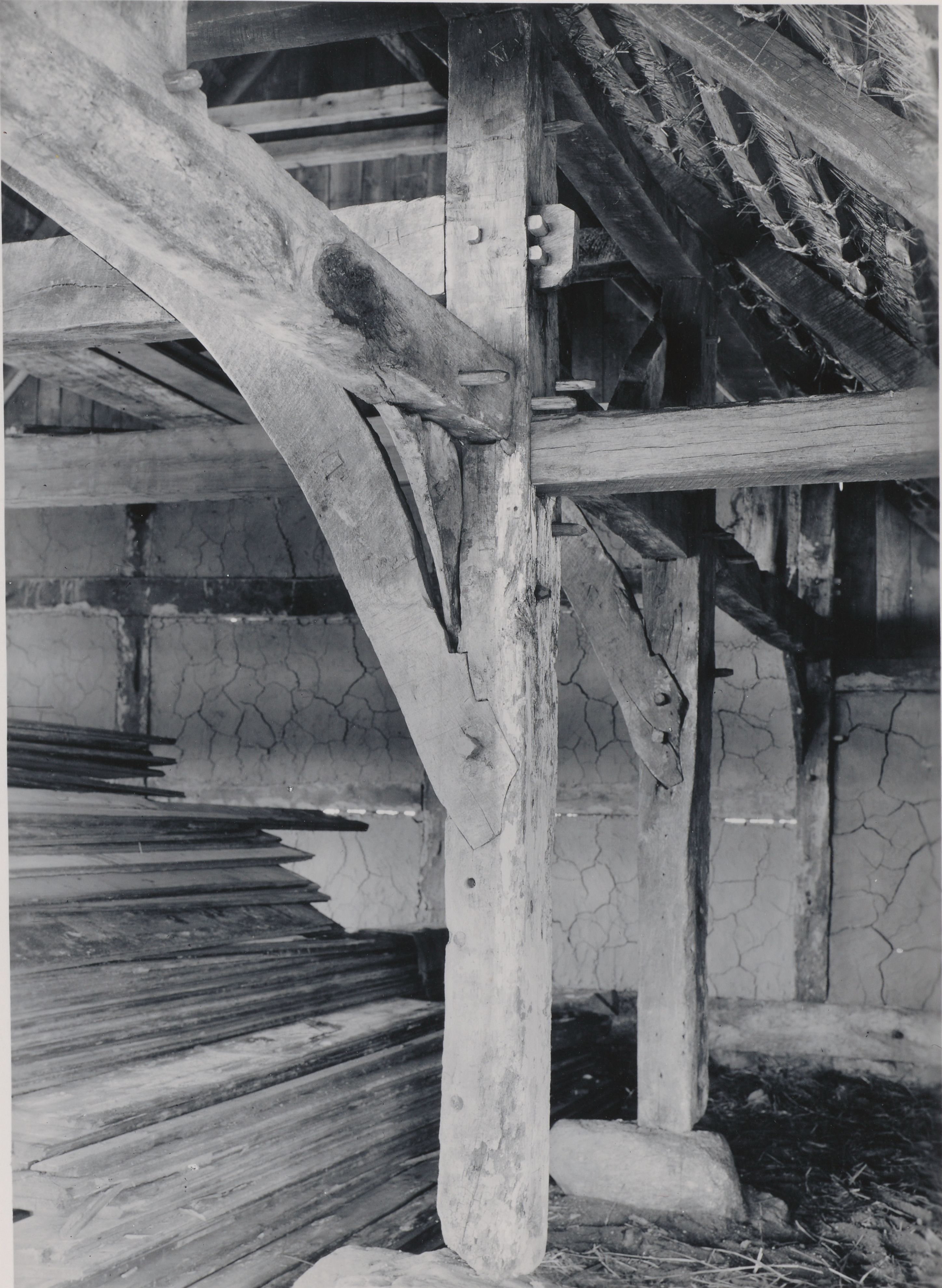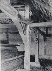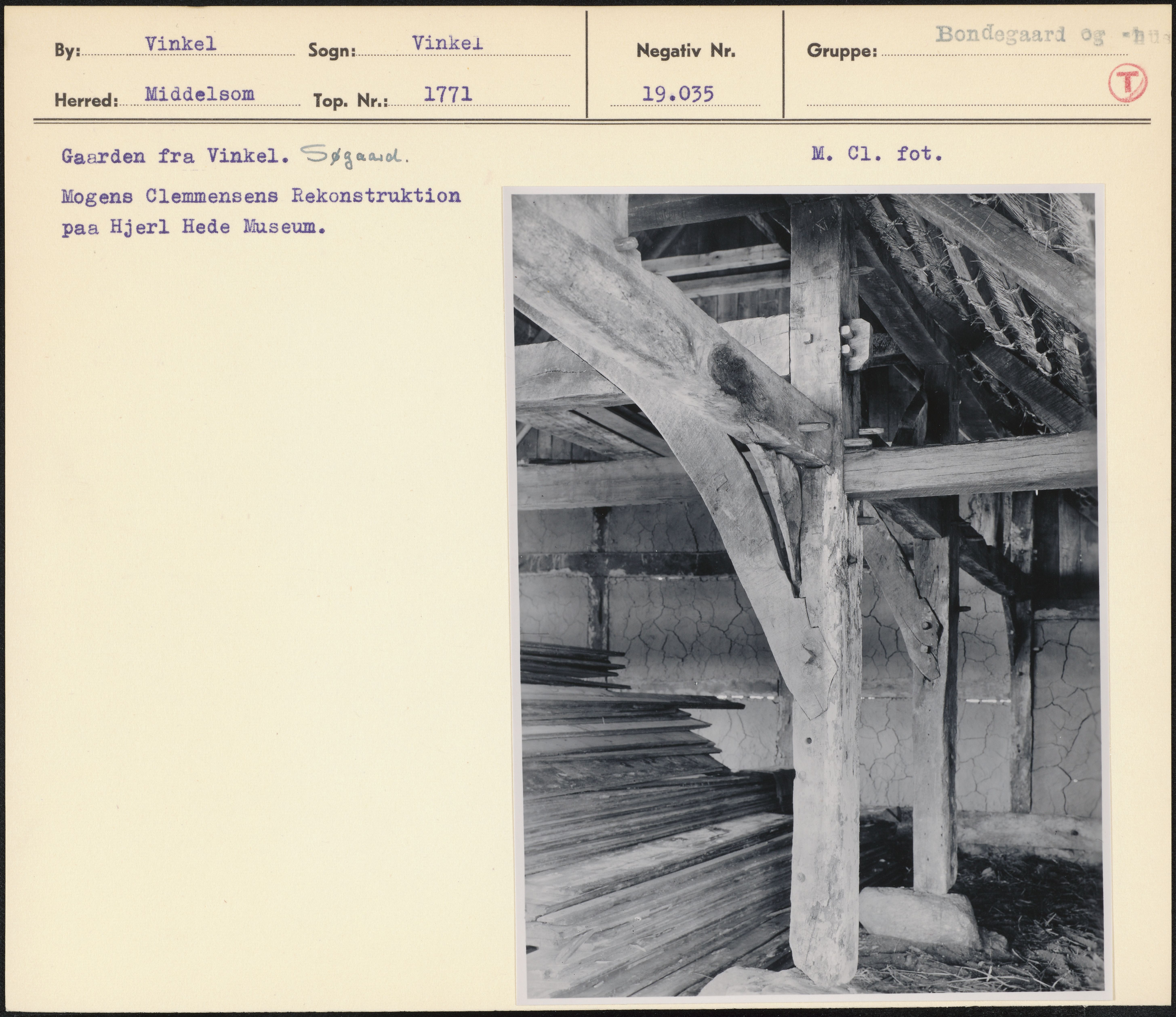 Maskingenkendt tekst fra arkivkort. Gaarden fra Vinkel. Døqaa:ol. M. C1. fot. Mogens Clemmensens Rekonstruktion paa Hjerl Hede Museum.