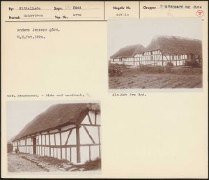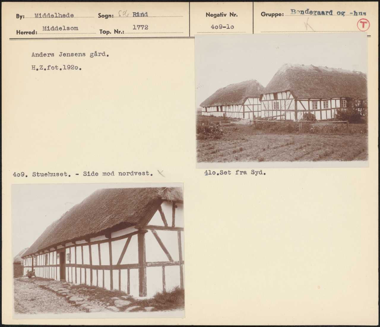 Maskingenkendt tekst fra arkivkort. Hee — .6 I - Anders Jensens gård, H,Z.fot 1920- 0 409, Stuehuset- Side mod nordvest. X 410,Set fra Syd,