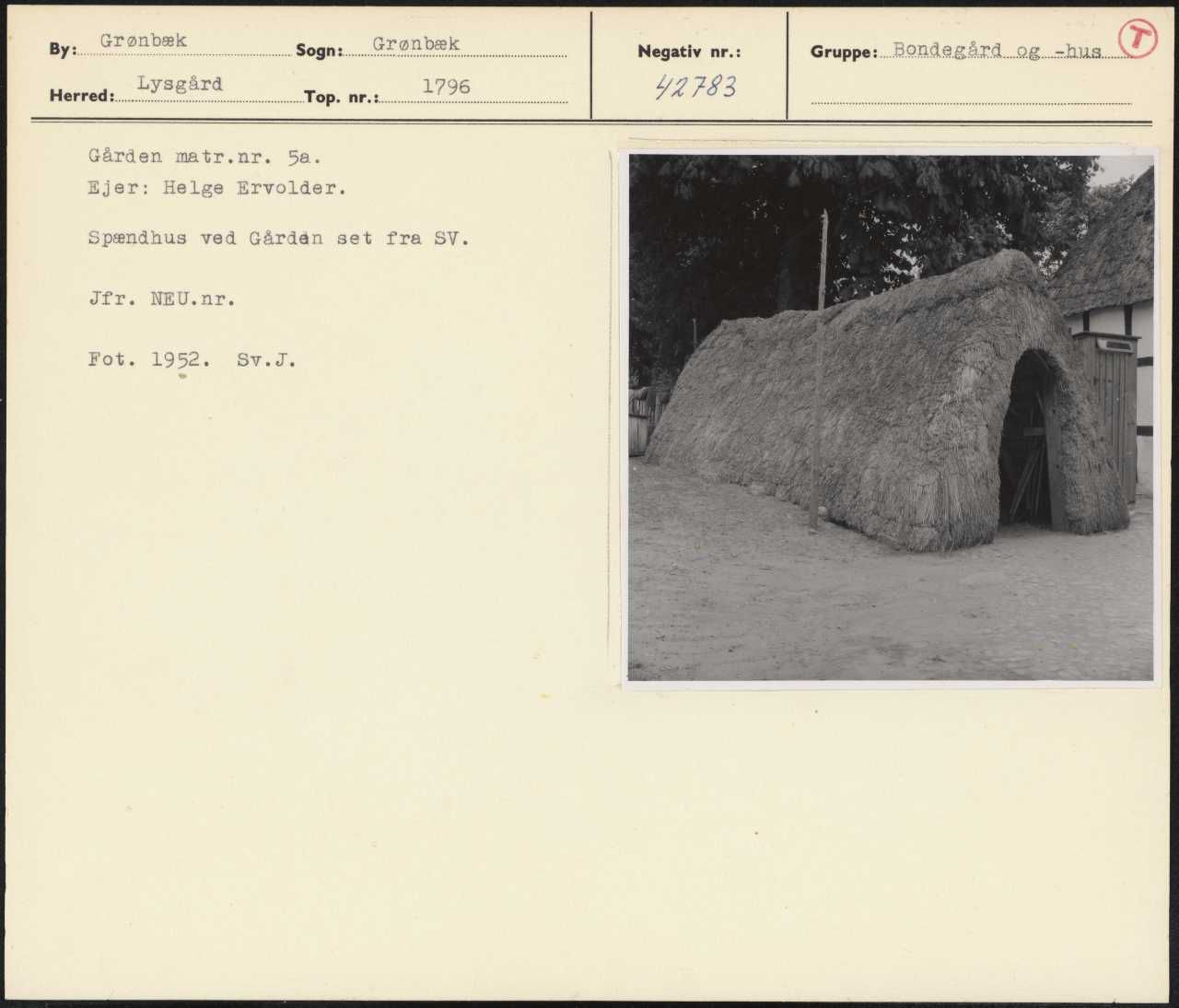 Maskingenkendt tekst fra arkivkort. Gården matr.nr. 58. en - Ejer: Helge Ervolder. Spændhus ved Gården set fra SV. Jfr. NEU.nr. Fot. 1952. Sv.J.