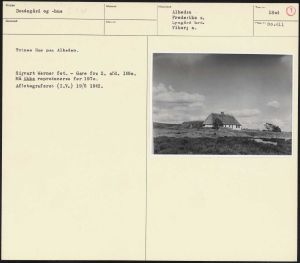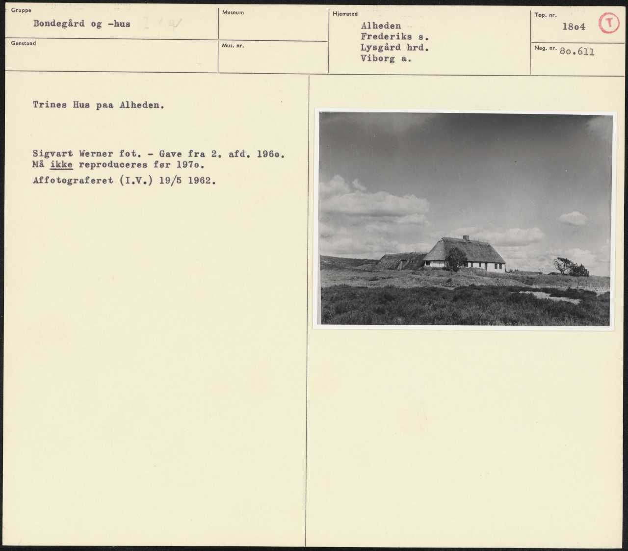 Maskingenkendt tekst fra arkivkort. Trines Hus paa Alheden. Sigvart Werner fot- Gave fra 2. afd. 1960. Må ikke reproduceres før 1970. Affotograferet (I.V) 19/5 1962.