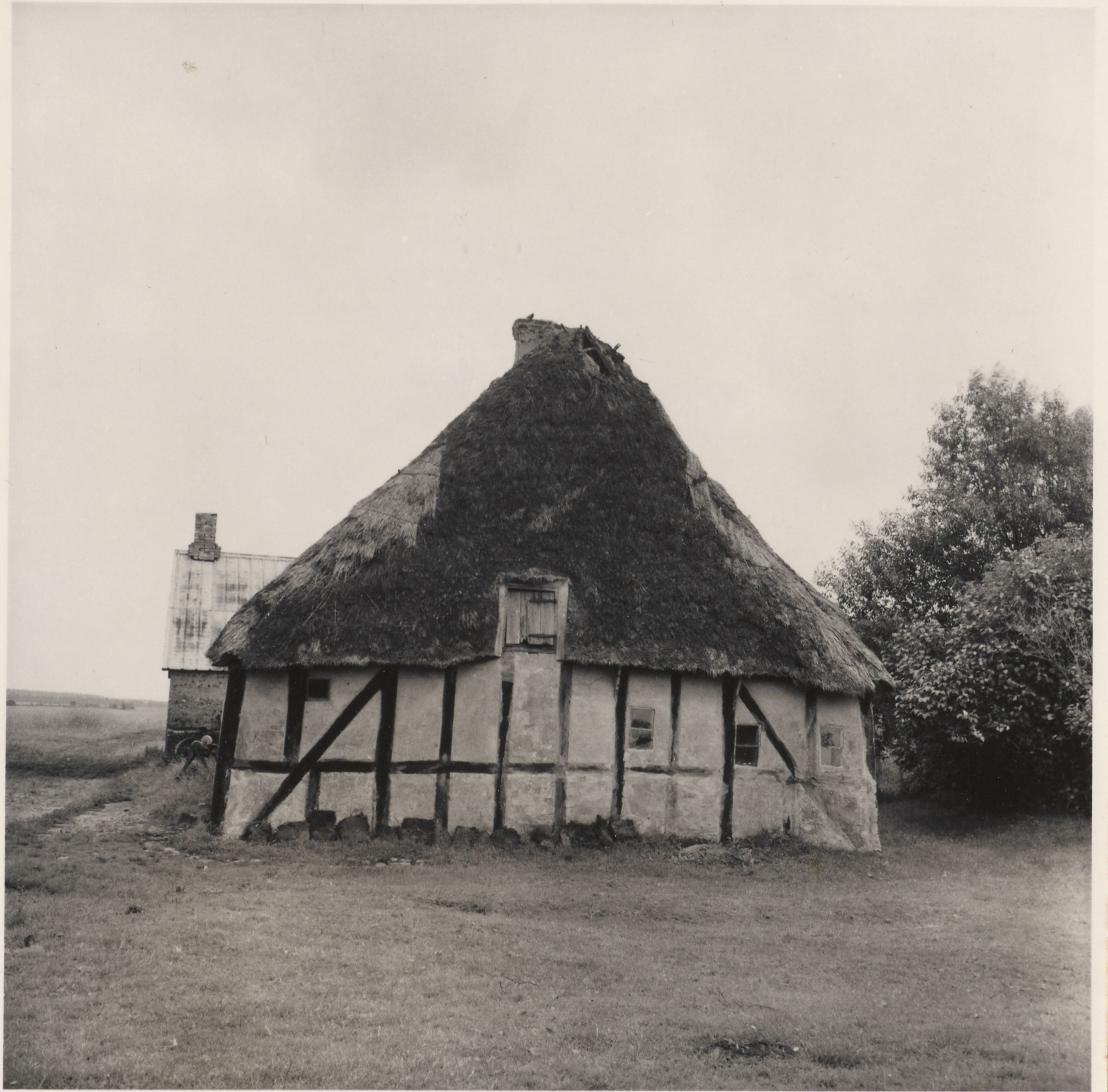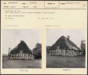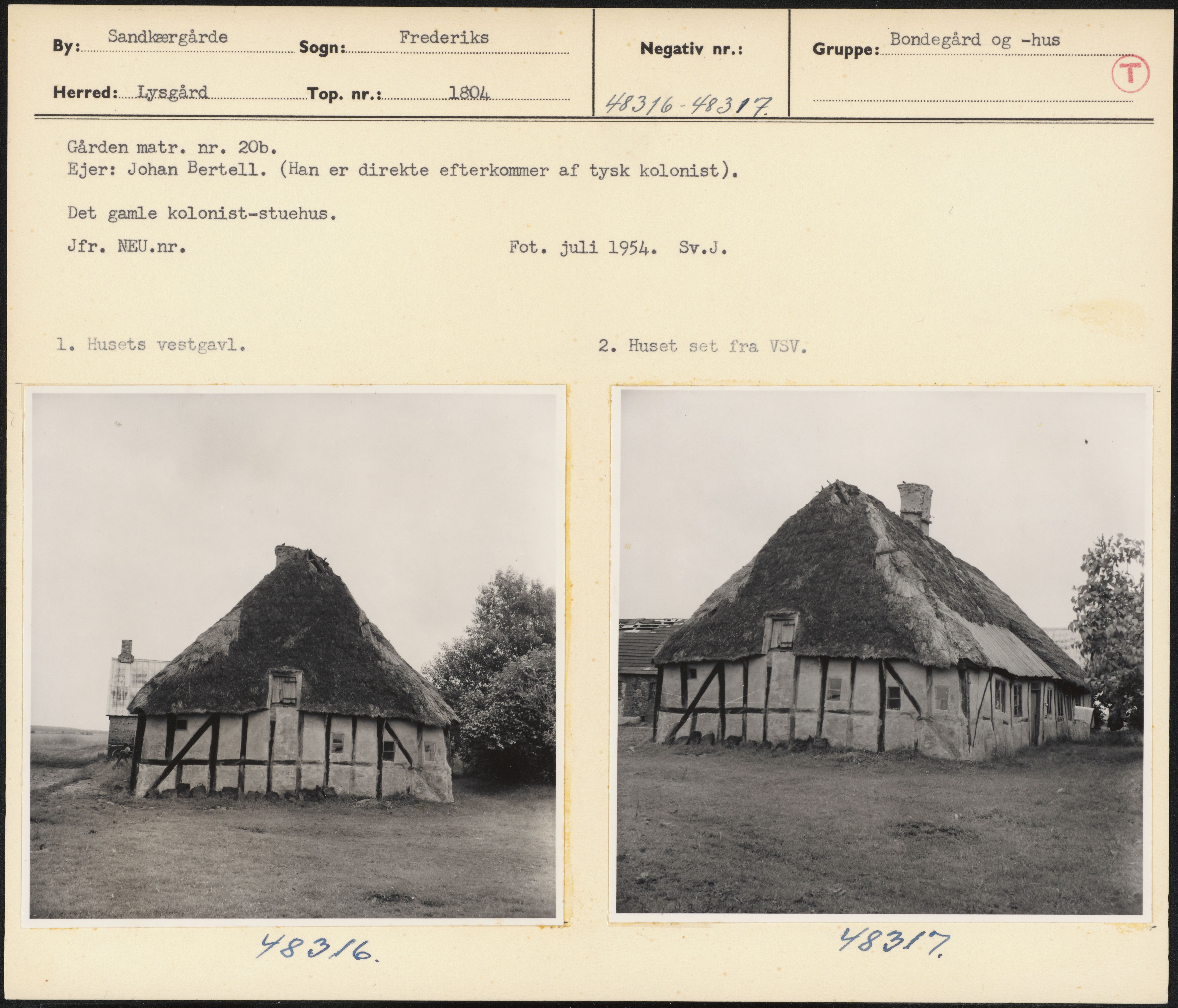 Maskingenkendt tekst fra arkivkort. Gården matr. nr. 20b, Ejer: Johan Bertell(Han er direkte efterkommer af tysk kolonist). Det gamle kolonist-stuehus; Jfr. NEU.nr. Fot. juli 1954. BSv.J. 1. Husets vestgavl. 2. Huset set fra VSV. FØLE. mr FIÉFPØL 7