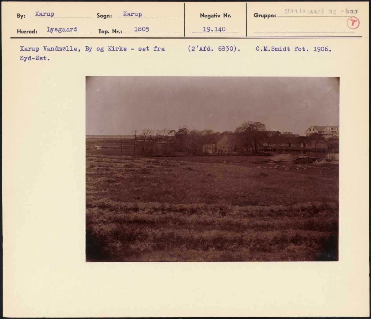 Maskingenkendt tekst fra arkivkort. Karup Vandmølle, By og Kirke - set fra (2/Afa. 6830). 0.M.Smidt fot. 1906. Syd-Øst.