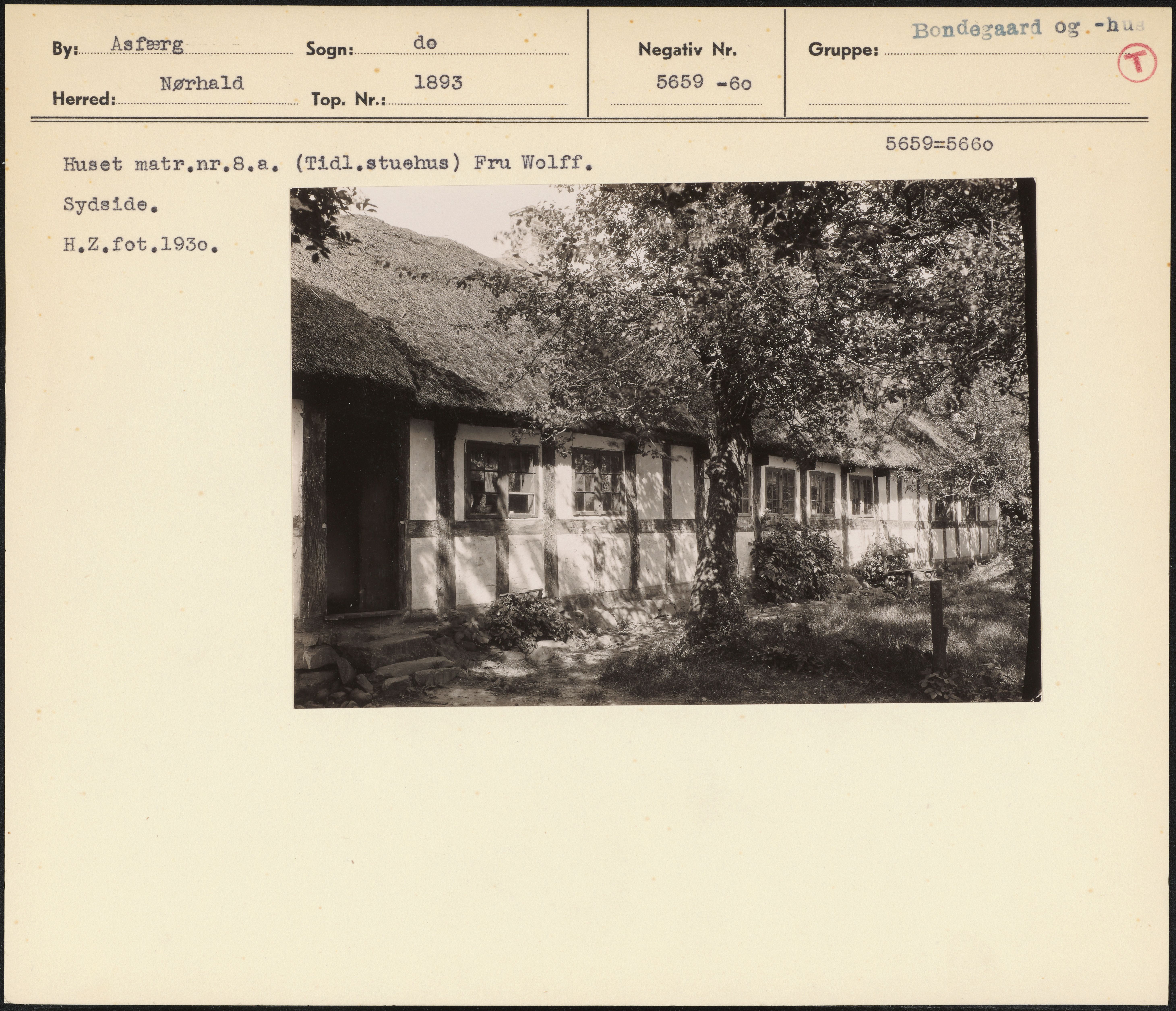 Maskingenkendt tekst fra arkivkort. 5659=5660 Huset matr.nr,8,a(Tidl,stuehus) Fru Wolff, Sydside, H.Z.fot,1930,