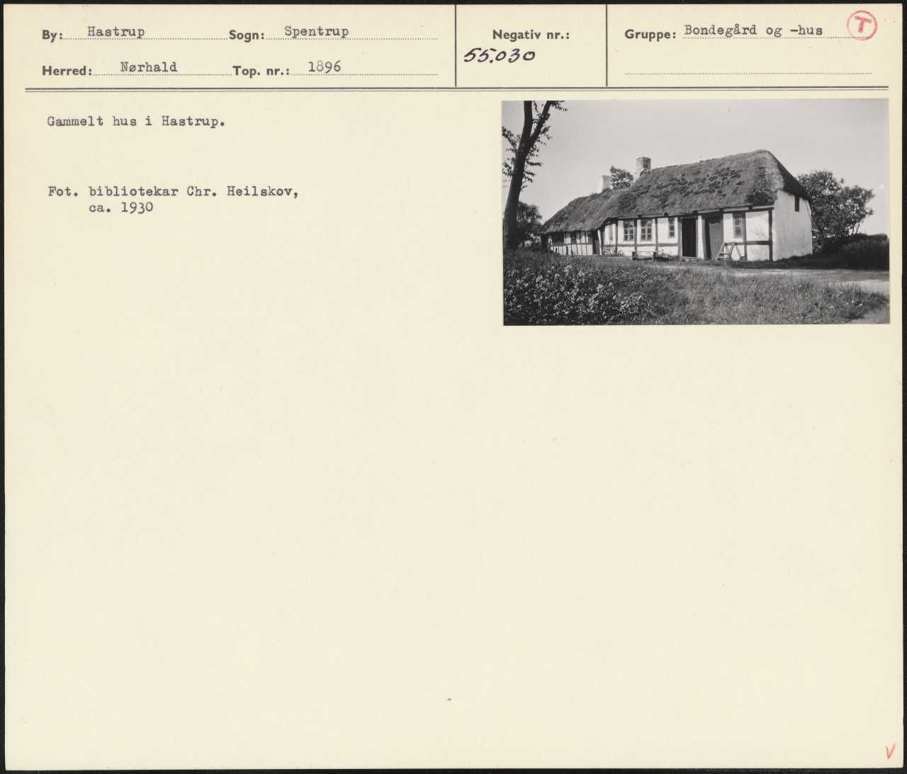 Maskingenkendt tekst fra arkivkort. Gammelt hus i Hastrup. Fot. bibliotekar Chr. Heilskov, Ca 1930