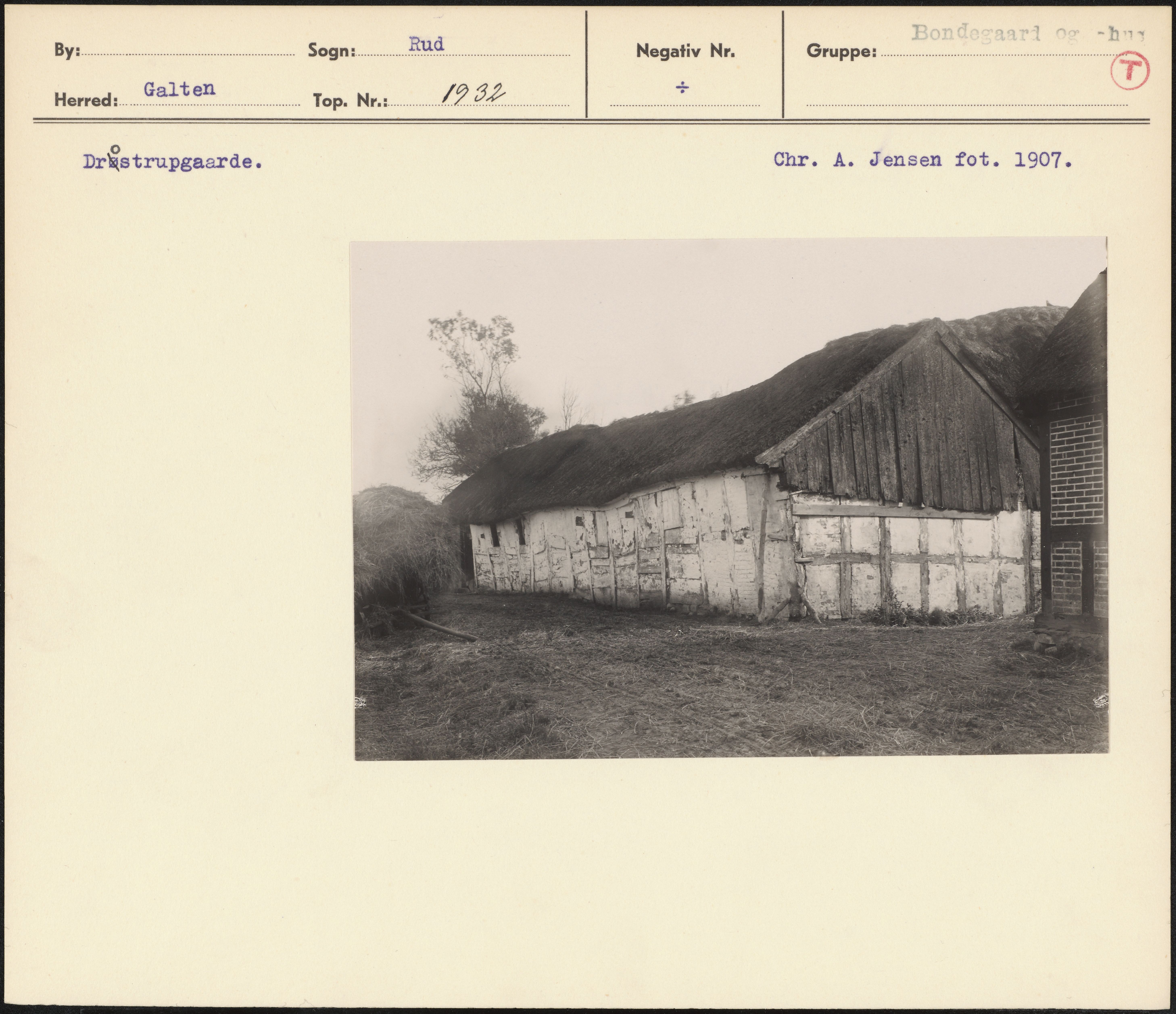 Maskingenkendt tekst fra arkivkort. Dråstrupgaarde. Chr. A. Jensen fot. 1907.