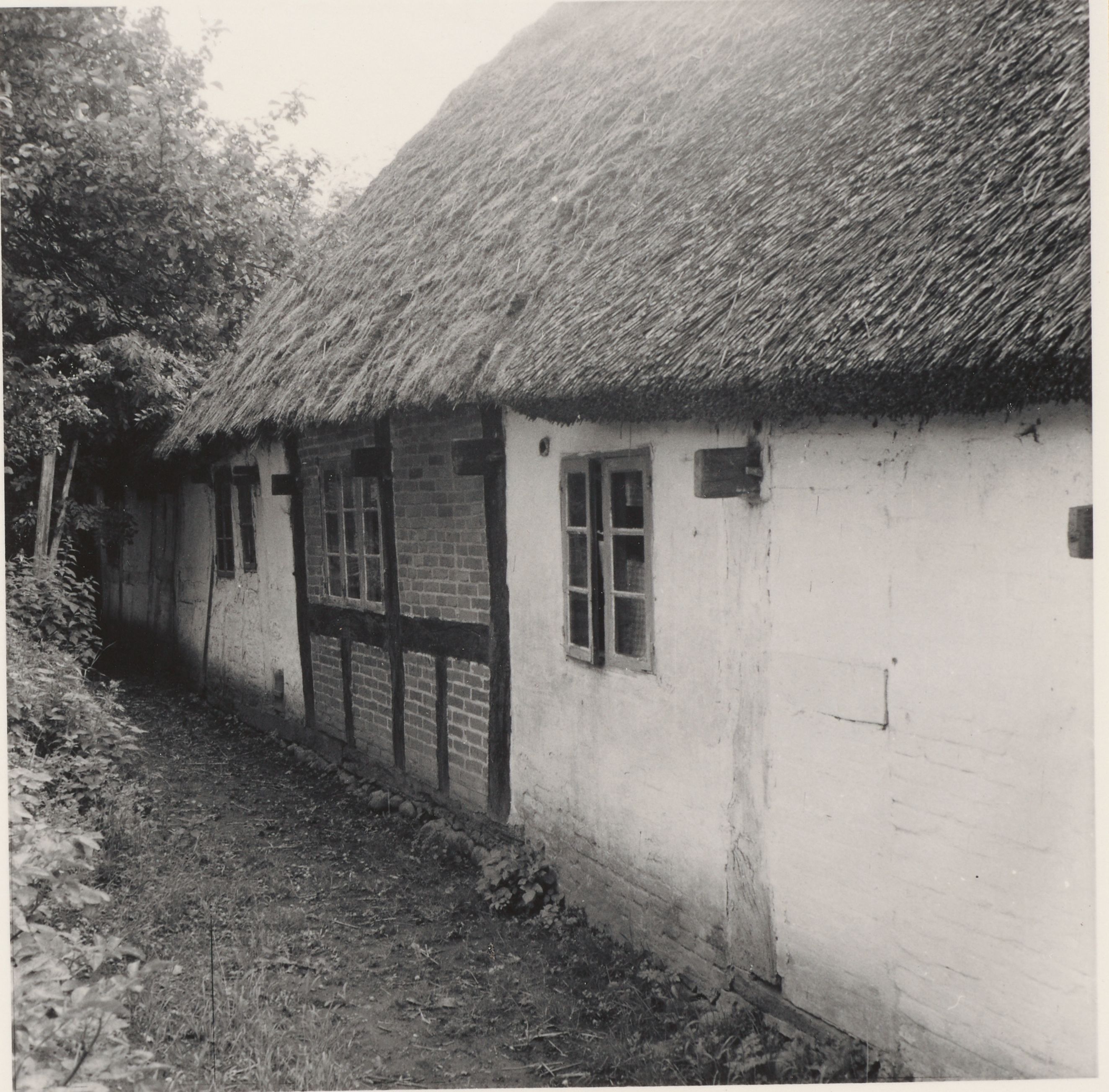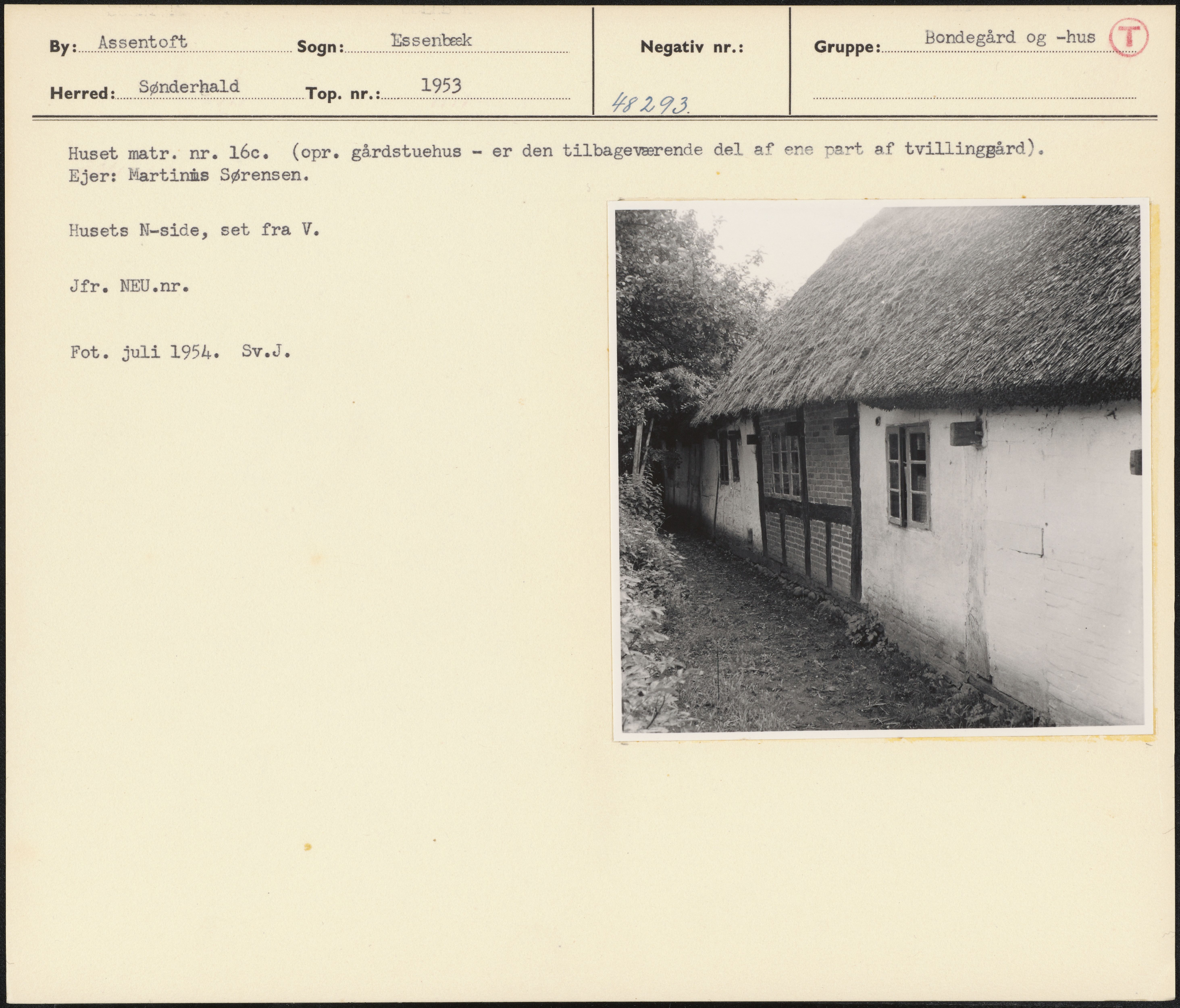 Maskingenkendt tekst fra arkivkort. Huset matr. nr. 16c(opr. gårdstuehus - er den tilbageværende del af ene part af tvillinggård). Ejer: Martinis Sørensen. Husets N-side, set fra V. Jfr. NEU.nr. Fot. juli 1954. Sv.d.