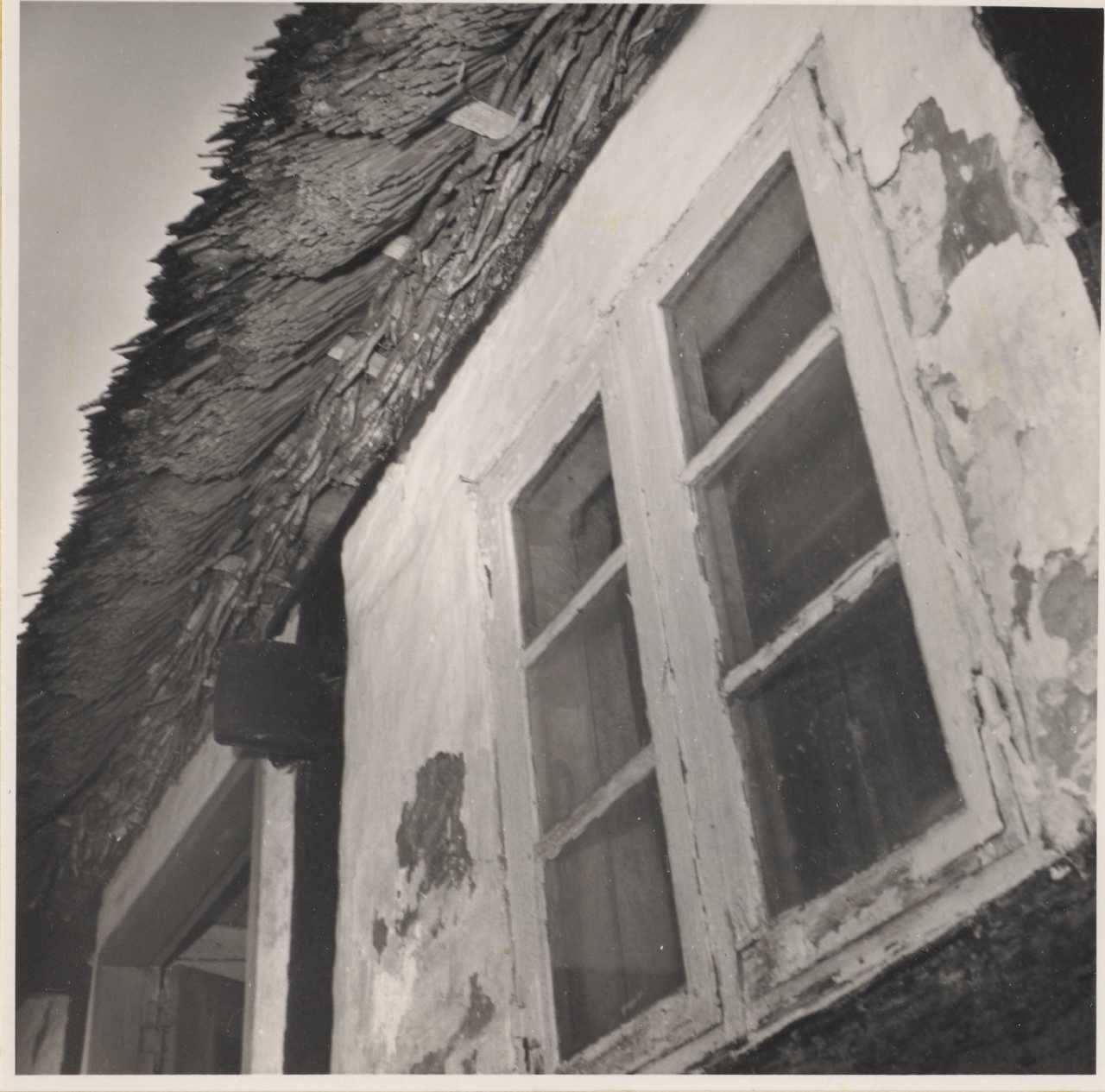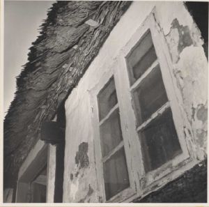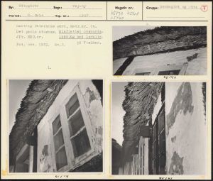 Maskingenkendt tekst fra arkivkort. Hartvig Petersens gård, matr.nr. 7b? Det gamle stuehus. Risflettet ovsbords- Jfr. NEU.nr. lukning med lerklin. Fot. okt. 1952. BSv.J. på V-siden. 1. &S5/40 Y5f 27