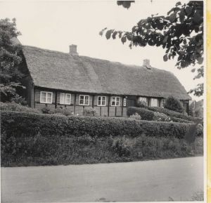 Maskingenkendt tekst fra arkivkort. Den gamle skole, der efter sigende skal være bygget omkr. 1740-50. Jfr. NEU.nr. Fot. juli 1954. BSv.J. 1. Skolen set fra VSV. 2. Trappen fra bygaden syd for skolen. HSÆ71 TEAK. mr