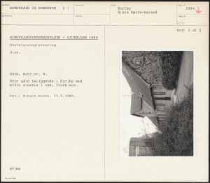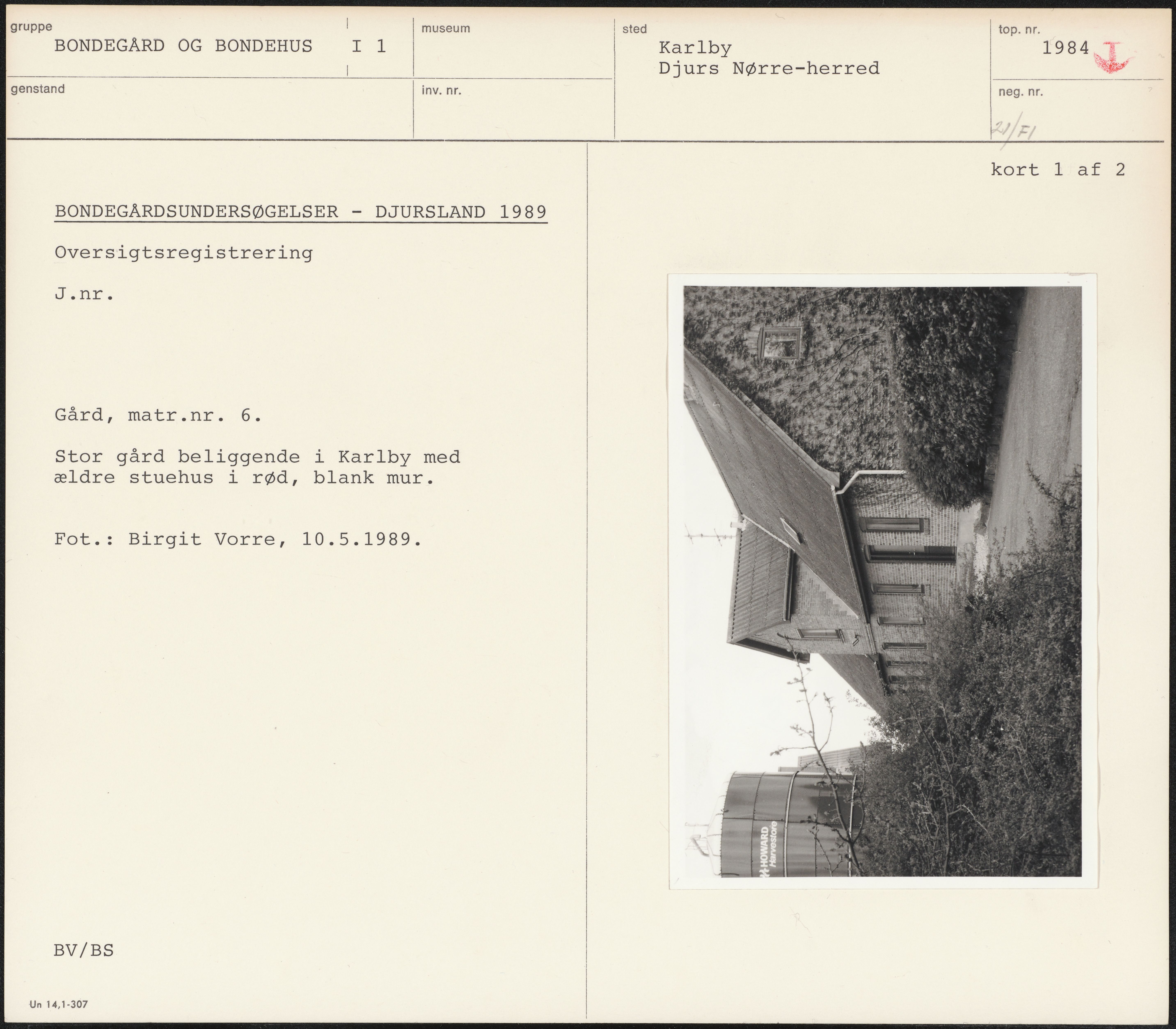 Maskingenkendt tekst fra arkivkort. BONDEGÅRDSUNDERSØGELSER - DJURSLAND 1989 Oversigtsregistrering J.nr. Gård, matr.nr. 6. Stor gård beliggende i Karlby med ældre stuehus i rød, blank mur. Fot: Birgit Vorre, 10.5.1989. BV/BS Un 14,1-307 kort 1 af 2
