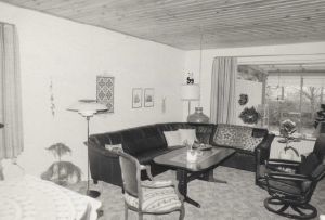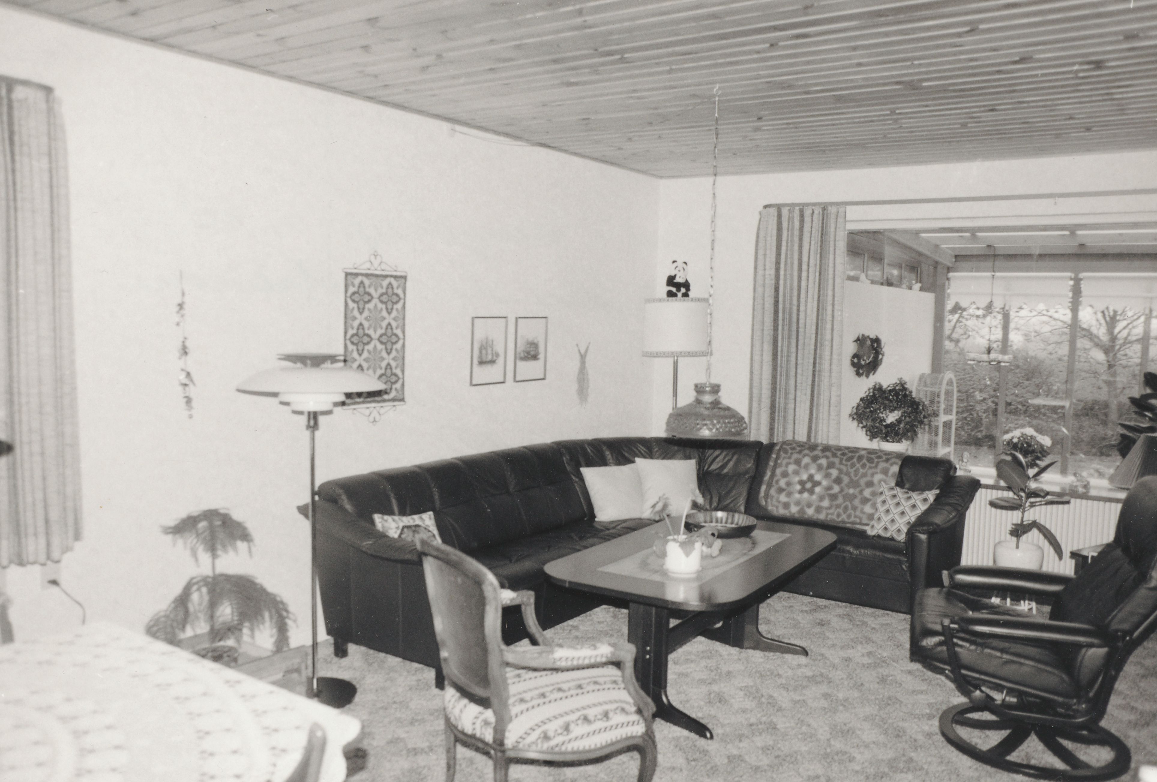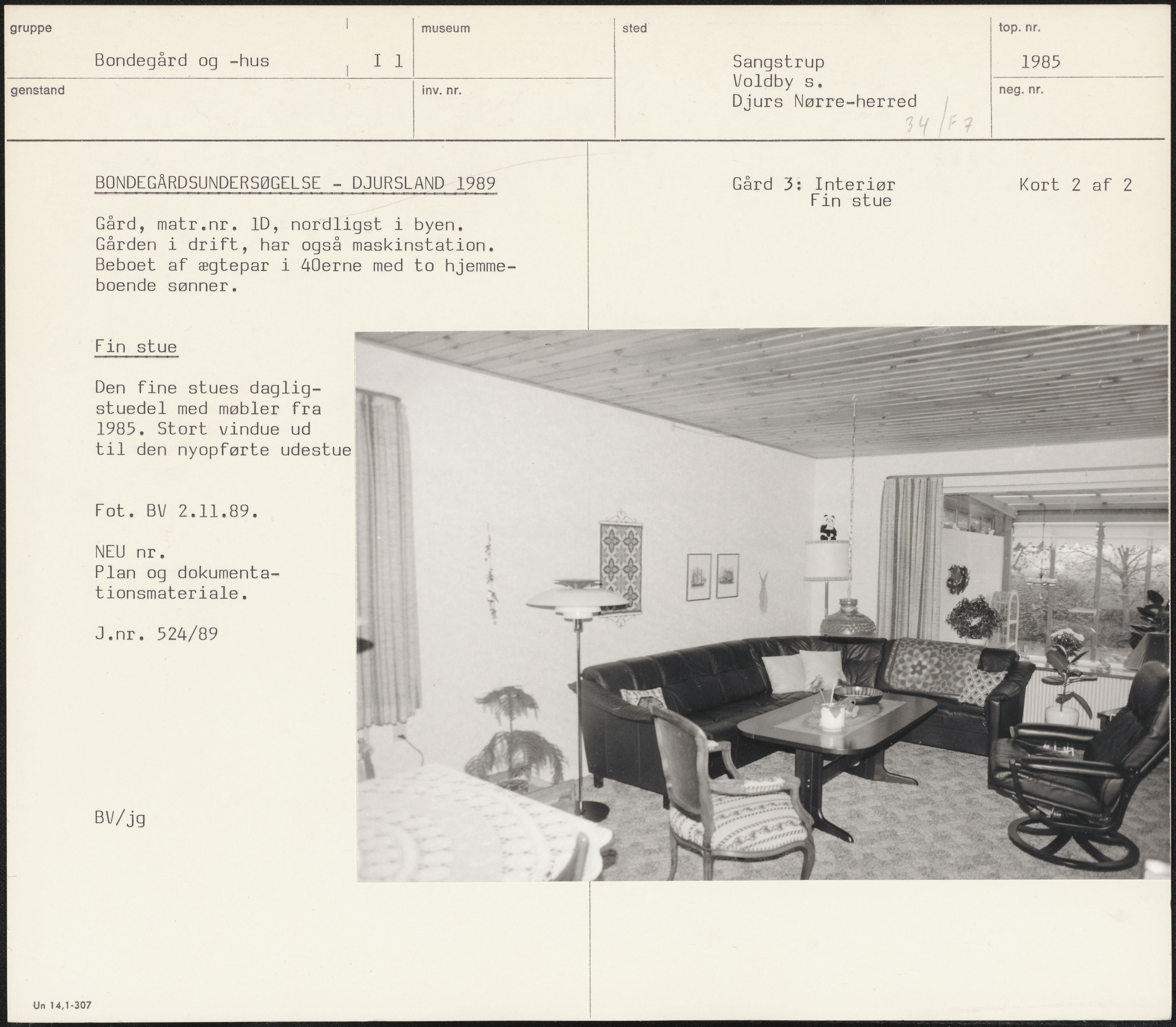 Maskingenkendt tekst fra arkivkort. BONDEGÅRDSUNDERSØGELSE - DJURSLAND 1989 Gård, matr.nr. 1D, nordligst i byen. Gården i drift, har også maskinstation. Beboet af ægtepar i 40erne med to hjemme- boende sønner. ” Fin stue Den fine stues daglig- stuedel med møbler fra 1985. Stort vindue ud til den nyopførte udestue Fot. BV 2.11.89. NEU nr. Plan og dokumenta- tionsmateriale. J.nr. 524/89 BV/jg Un 14,1-307 Gård 3: Interiør Kort 2 af 2 Fin stue