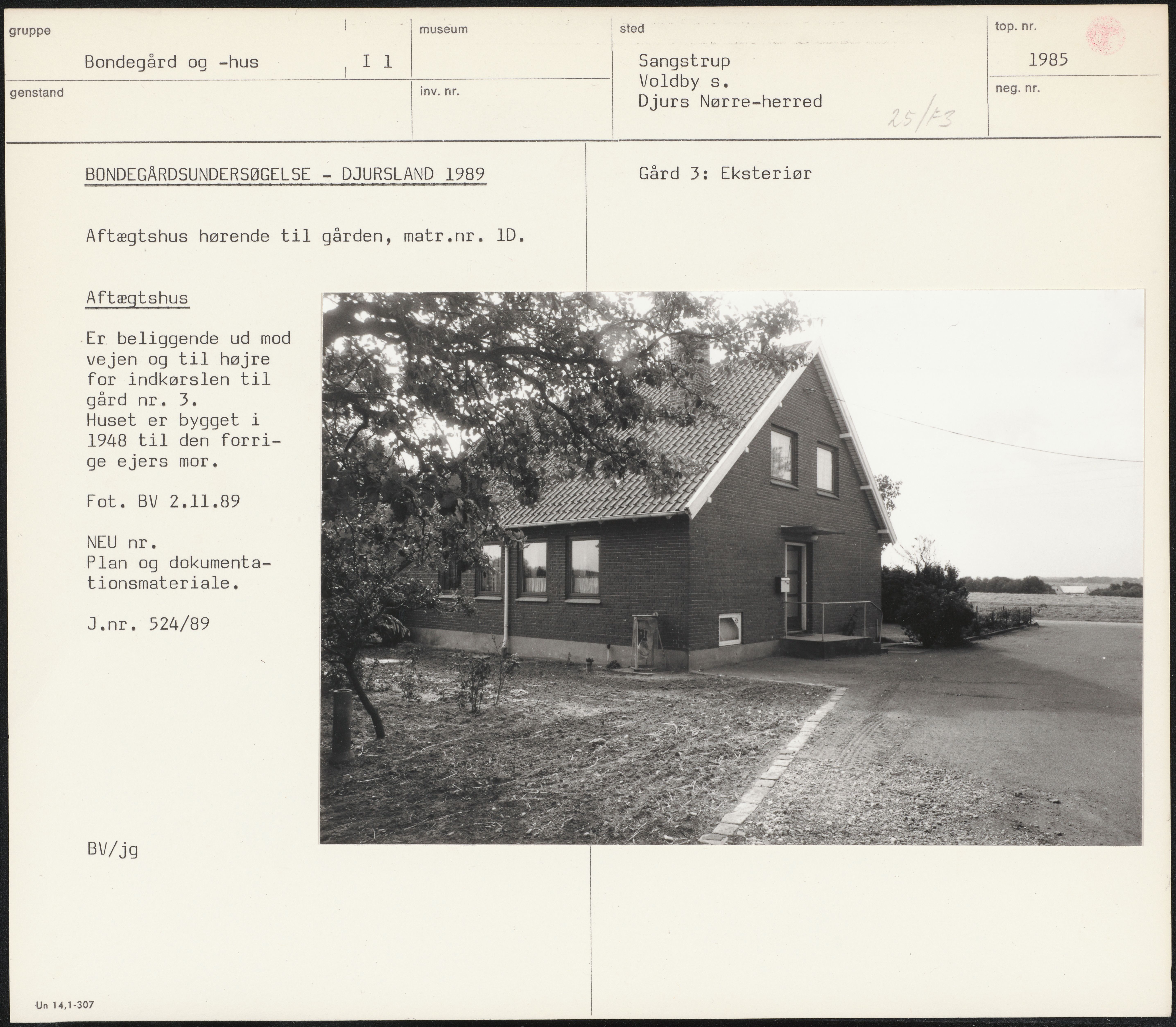Maskingenkendt tekst fra arkivkort. BONDEGÅRDSUNDERSØGELSE - DJURSLAND 1989 Aftægtshus hørende til gården, matr.nr. 1D. Aftægtshus .Er beliggende ud mod vejen og til højre for indkørslen til gård nr. 3. Huset er bygget i 1948 til den forri- ge ejers mor. Fot. BV 2.11.89 NEU nr. Plan og dokumenta- tionsmateriale. J.nr. 524/89 BV/jg Un 14,1-307 Gård 3: Eksteriør