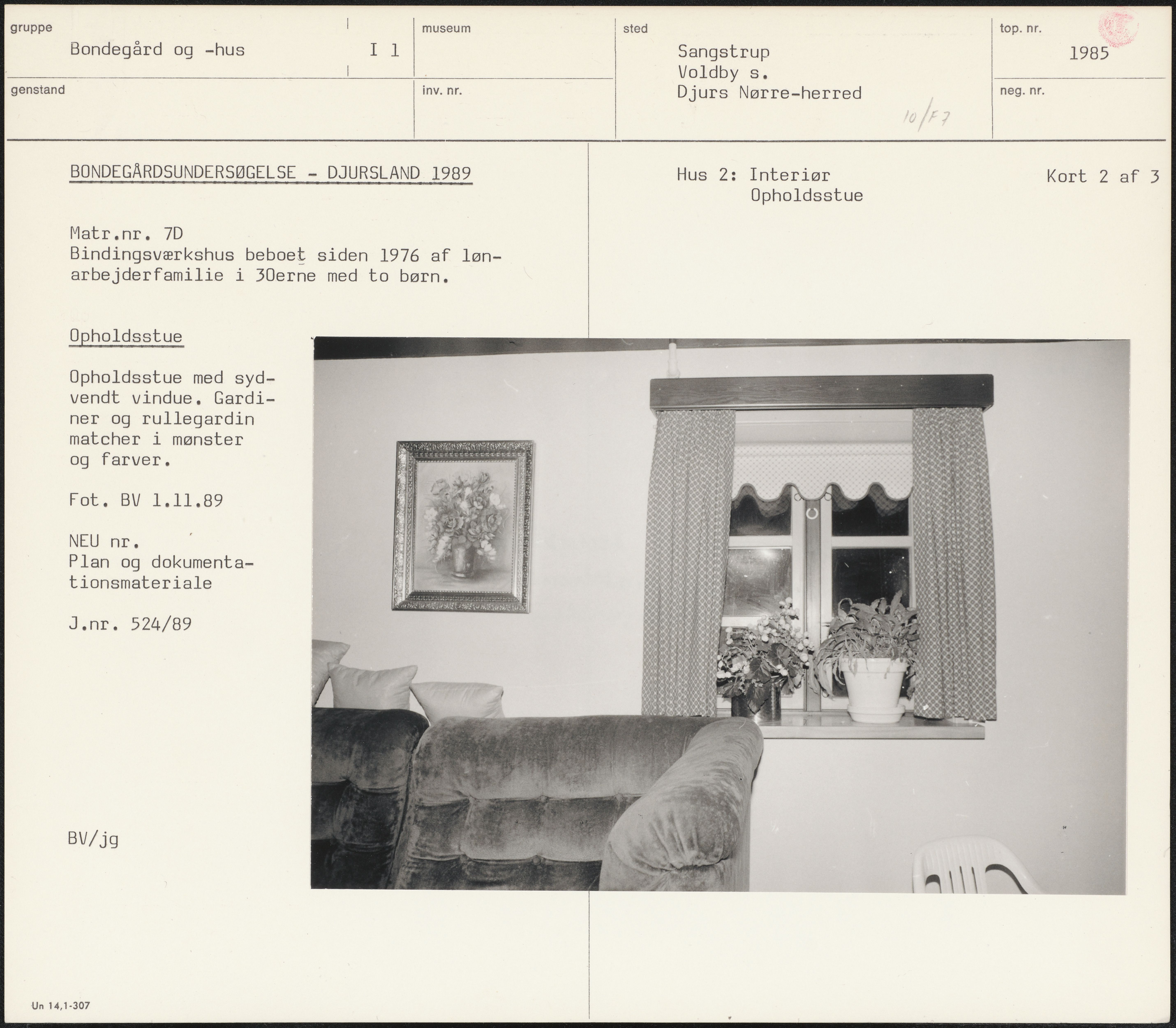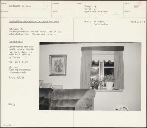 Maskingenkendt tekst fra arkivkort. BONDEGÅRDSUNDERSØGELSE - DJURSLAND 1989 Matr.nr. 7D Bindingsværkshus beboet siden 1976 af løn- arbejderfamilie i 30erne med to børn. Opholdsstue Opholdsstue med syd- vendt vindue. Gardi- ner og rullegardin matcher i mønster og farver. Fot. BV 1.11.89 NEU nr. mn Plan og dokumenta- tionsmateriale J.nr. 524/89 BV/jg Un 14,1-307 Hus 2: Interiør Kort 2 af 3 Opholdsstue