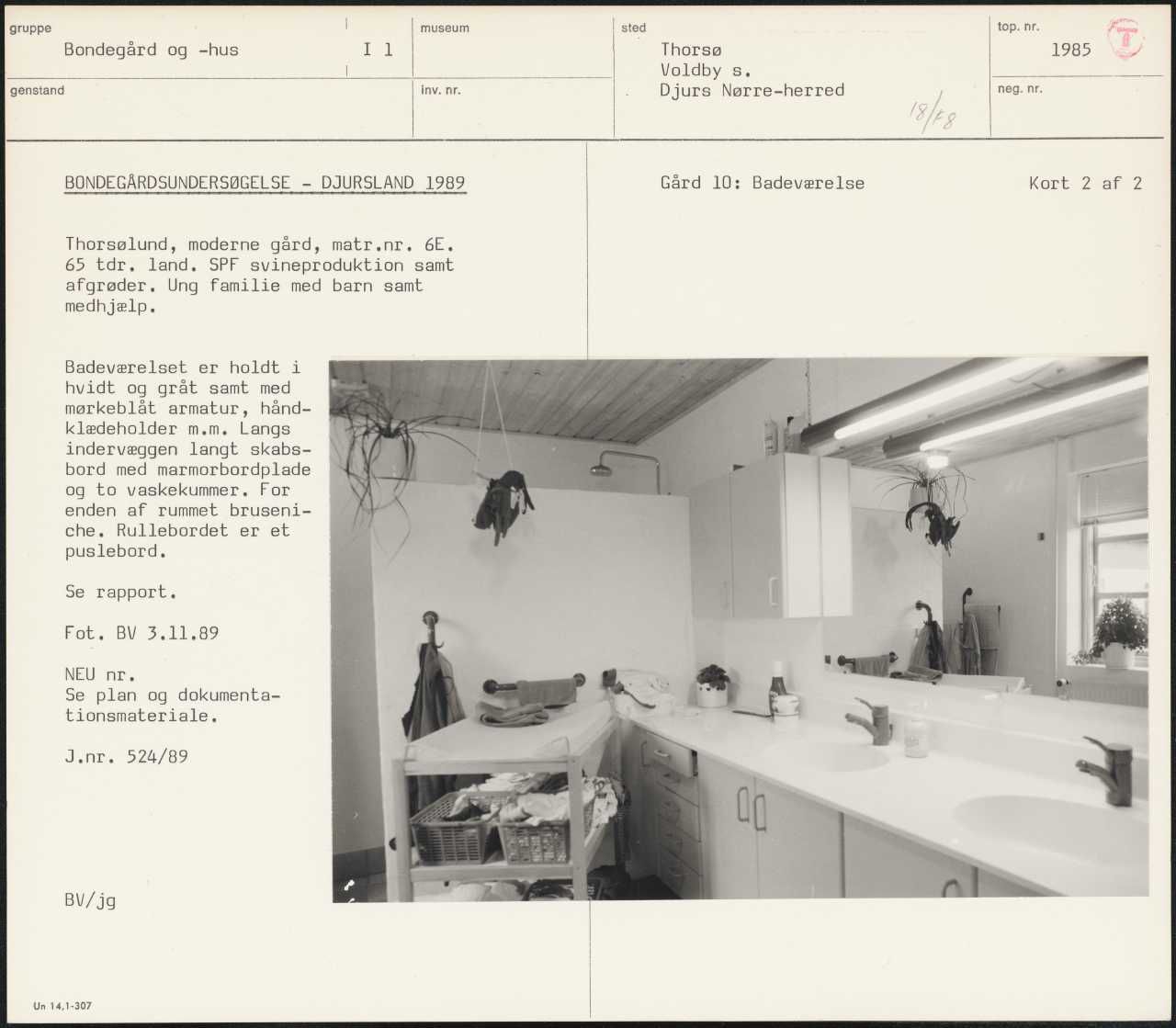 Maskingenkendt tekst fra arkivkort. BONDEGÅRDSUNDERSØGELSE - DJURSLAND 1989 Thorsølund, moderne gård, matr.nr. 6E. 65 tdr. land. SPF svineproduktion samt afgrøder. Ung familie med barn samt medhjælp. Badeværelset er holdt i hvidt og gråt samt med mørkeblåt armatur, hånd- klædeholder m.m. Langs indervæggen langt skabs- bord med marmorbordplade og to vaskekummer. For enden af rummet bruseni- che. Rullebordet er et ; puslebord, Se rapport. Fot. BV 3.11,89 NEU nr. Se plan og dokumenta- tionsmateriale. J.nr. 524/89 BV/jg Un 14,1-307 Gård 10: Badeværelse Kort 2 af 2