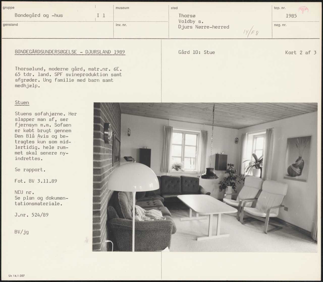 Maskingenkendt tekst fra arkivkort. BONDEGÅRDSUNDERSØGELSE - DJURSLAND 1989 Thorsølund, moderne gård, matr.nr. 6E. 65 tdr. land. SPF svineproduktion samt afgrøder. Ung familie med barn samt medhjælp. Stuen Stuens sofahjørne. Her slapper man af, ser fjernsyn m.m. Sofaen er købt brugt gennem . Den Blå Avis og be- tragtes kun som mid- lertidig. hele rum- > met skal senere ny- indrettes. Se rapport. Fot, BV 3.11.89 NEU nr. Se plan og dokumen; tationsmateriale. J.nr. 524/89 BV/jg Un 14,1-307 Gård 10: Stue Kort 2 af 3
