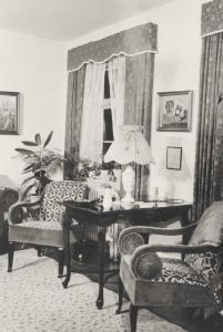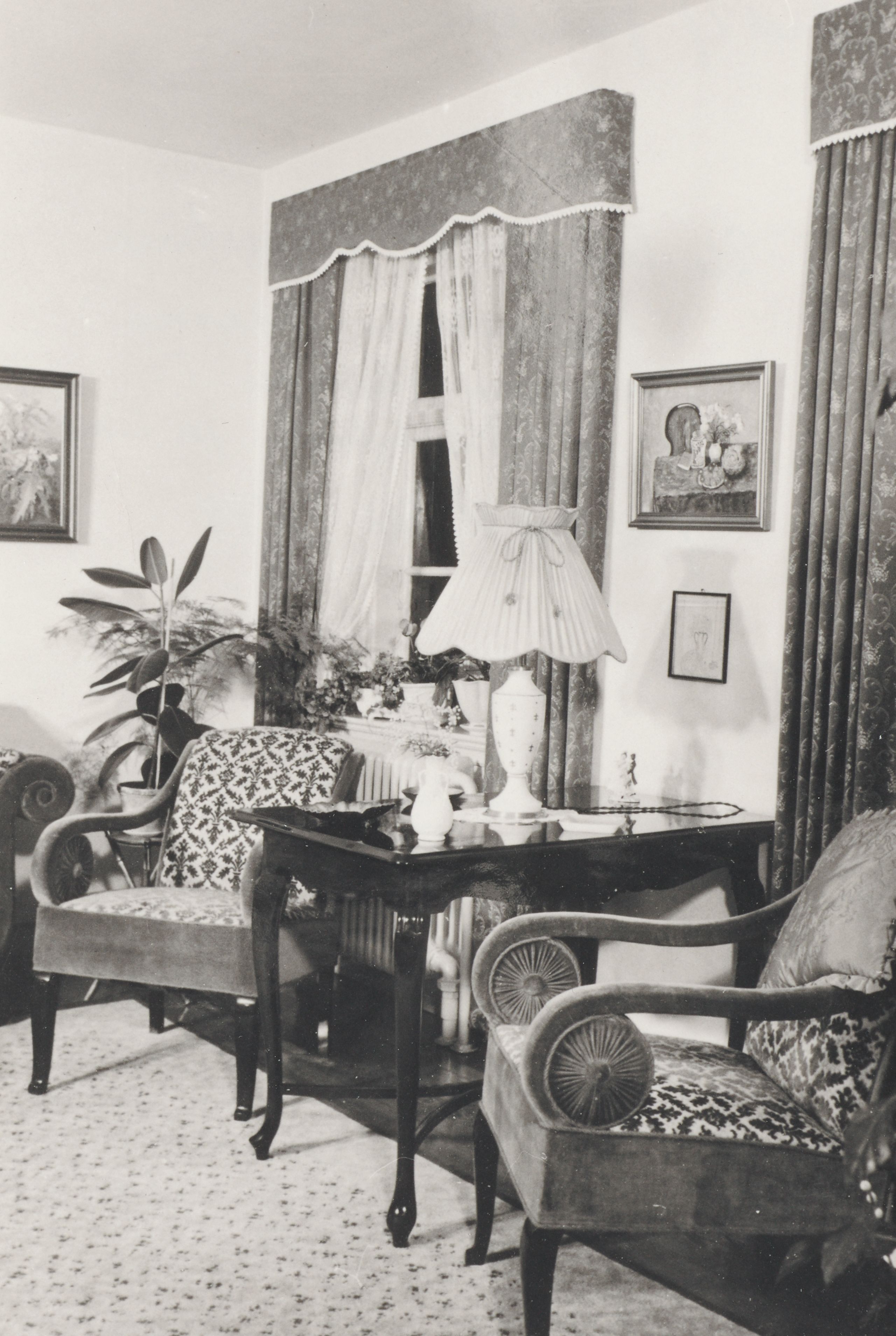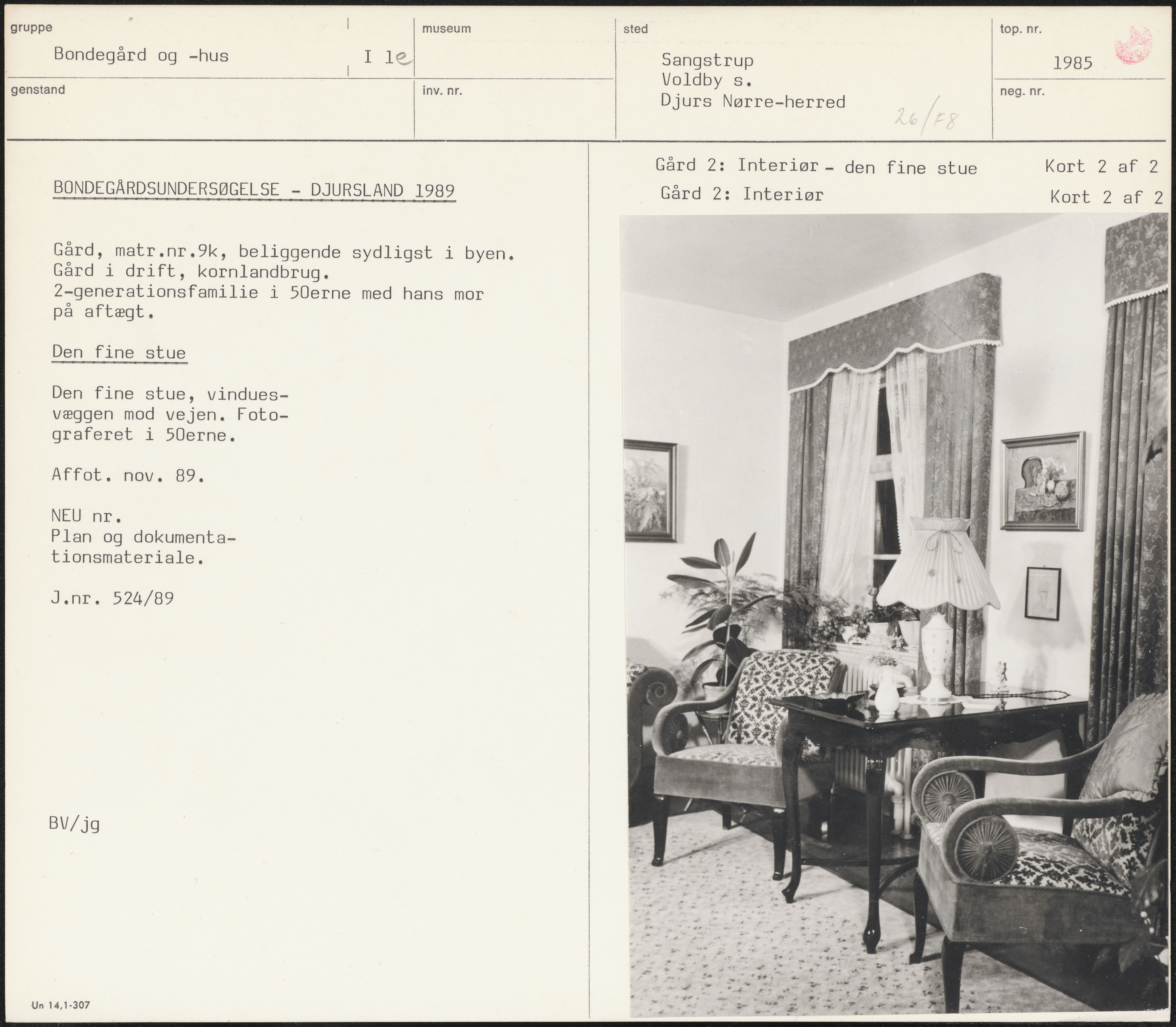 Maskingenkendt tekst fra arkivkort. BONDEGÅRDSUNDERSØGELSE - DJURSLAND 1989 Gård, matr.nr.9k, beliggende sydligst i byen. Gård i drift, kornlandbrug. 2-generationsfamilie i 50erne med hans mor på aftægt. Den fine stue Den fine stue, vindues- væggen mod vejen. Foto- graferet i 50erne. Affot. nov. 89. NEU nr. Plan og dokumenta- n tionsmateriale. J.nr. 524/89 BV/jg Un 14,1-307 Gård 2: Interiør - den fine stue Kort 2 af 2 Gård 2: Interiør Kort 2 af 2