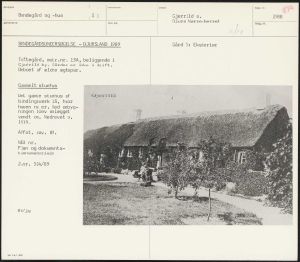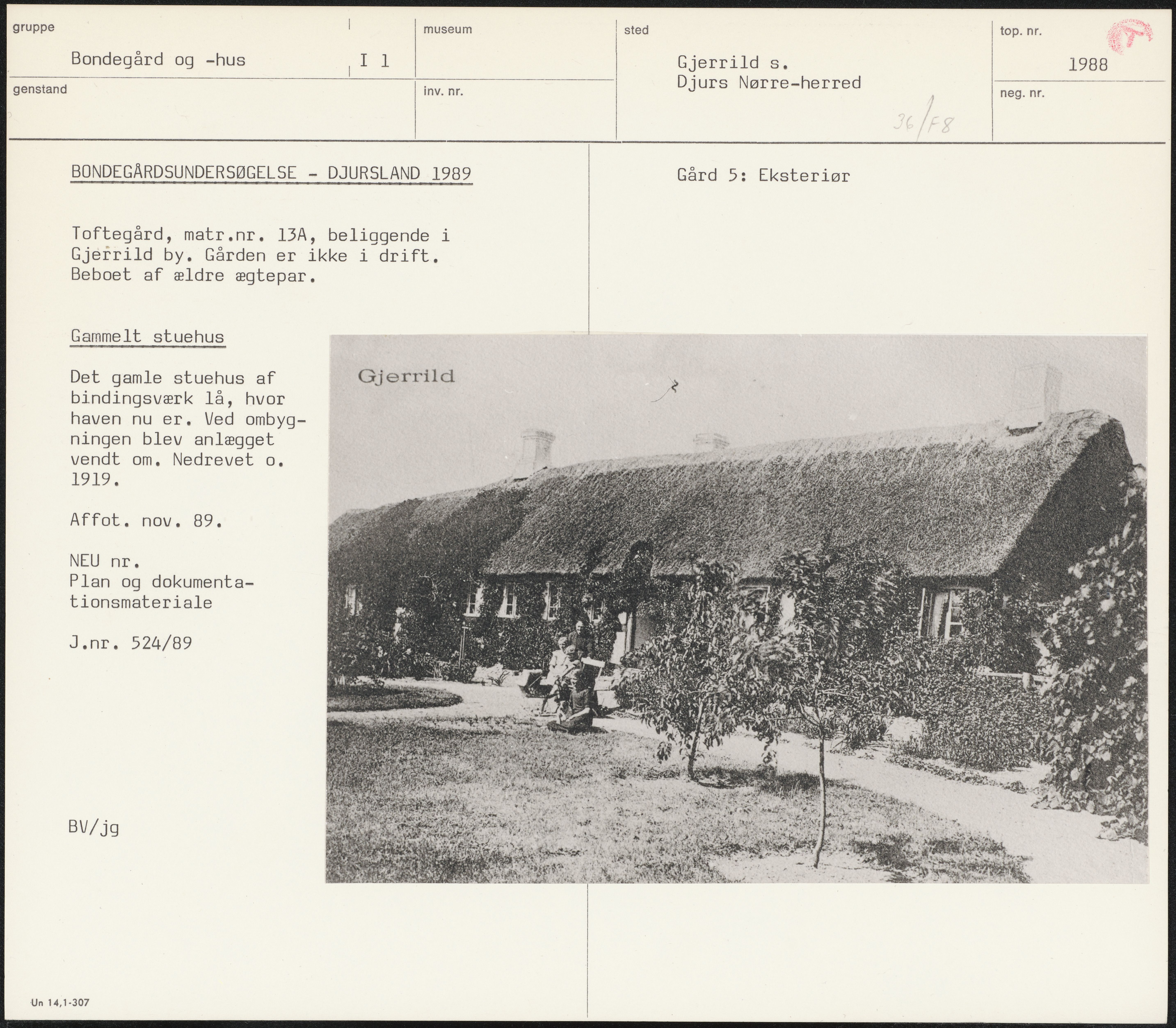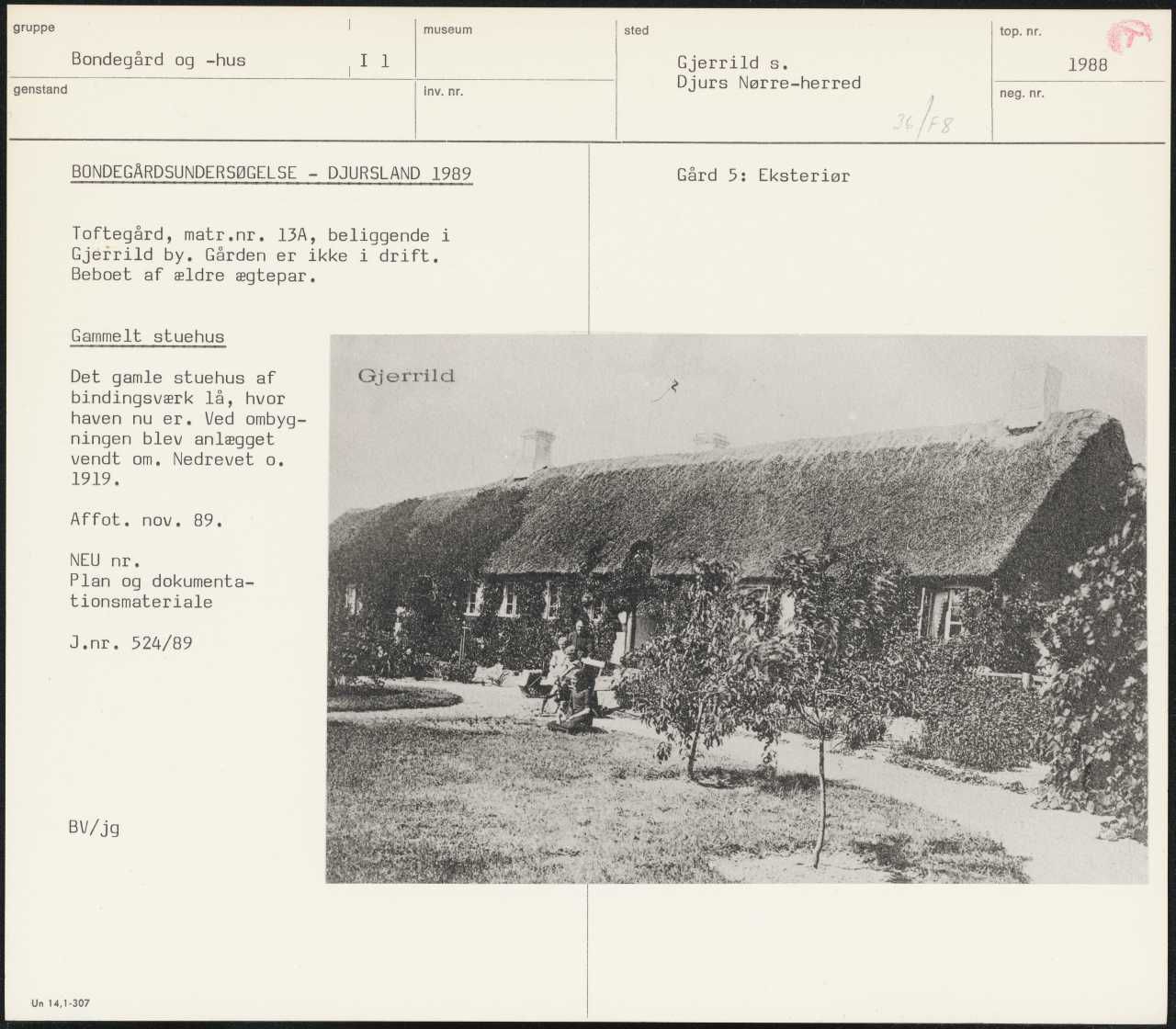 Maskingenkendt tekst fra arkivkort. BONDEGÅRDSUNDERSØGELSE - DJURSLAND 1989 Toftegård, matr.nr. 13A, beliggende i Gjerrild by. Gården er ikke i drift. Beboet af ældre ægtepar. Gammelt stuehus Det gamle stuehus af bindingsværk 1å, hvor haven nu er. Ved ombyg- ningen blev anlægget vendt om, Nedrevet 0. 1919. Affot. nov. 89. NEU nr. Plan og dokumenta- tionsmateriale J.nr. 524/89 BV/jg Un 14,1-307 Gård 5: Eksteriør