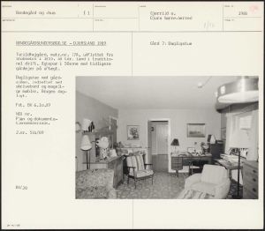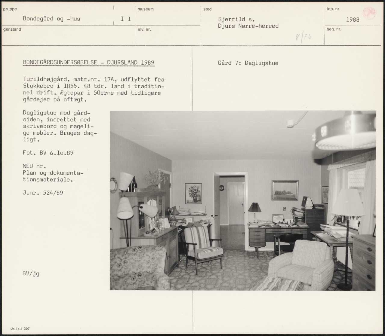 Maskingenkendt tekst fra arkivkort. BONDEGÅRDSUNDERSØGELSE - DJURSLAND 1989 Turildhøjgård, matr.nr. 17A, udflyttet fra Stokkebro i 1855. 48 tdr. land i traditio- nel drift, Ægtepar i 50erne med tidligere gårdejer på aftægt. Dagligstue mod gård- siden, indrettet med skrivebord og mageli- ge møbler. Bruges dag- ligt. Fot, BV 6.10,89 NEU nr. Plan og dokumenta- tionsmateriale. J.nr. 524/89 BV/jg Un 14,1-307 , Gård 7: Dagligstue