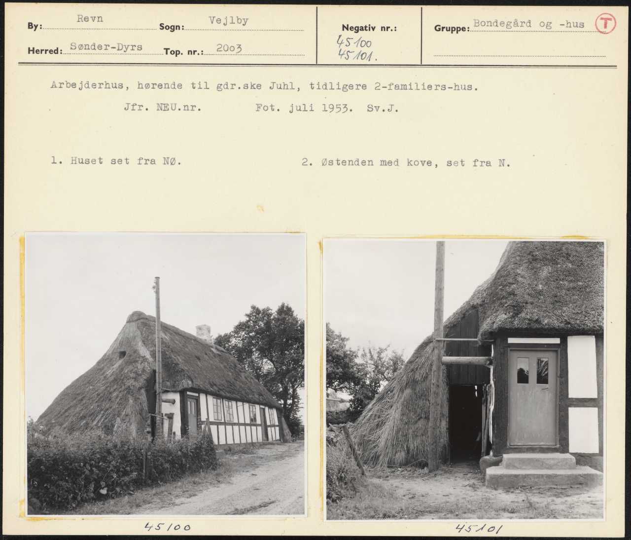 Maskingenkendt tekst fra arkivkort. Arbejderhus, hørende til går.ske Juhl, tidligere 2-familiers-hus. Jfr. NEU.nr. Fot. juli 1953. BSv.J. 1. Huset set fra NØ. 2. Østenden med kove, set fra N. 5 LS /00 SAD