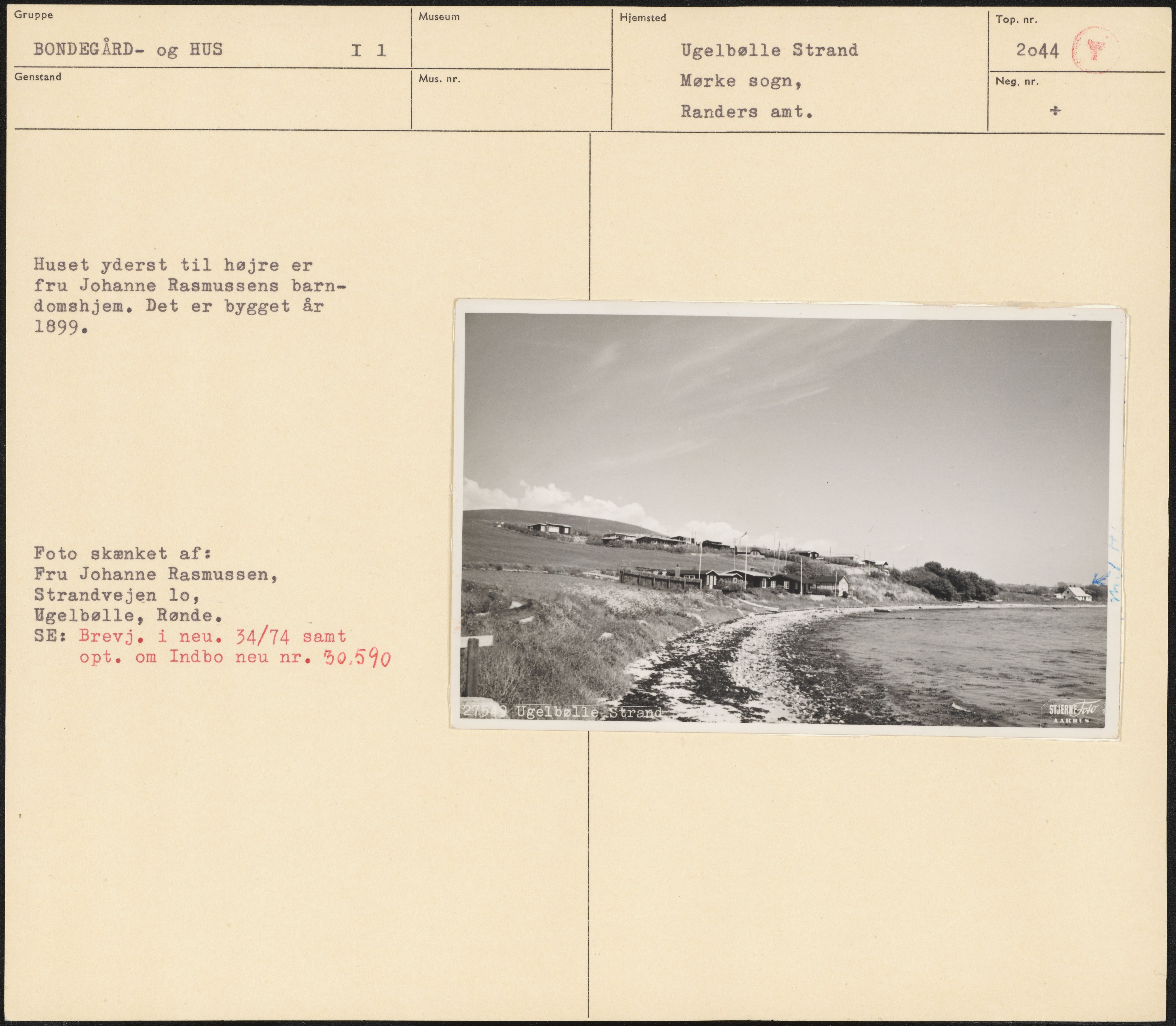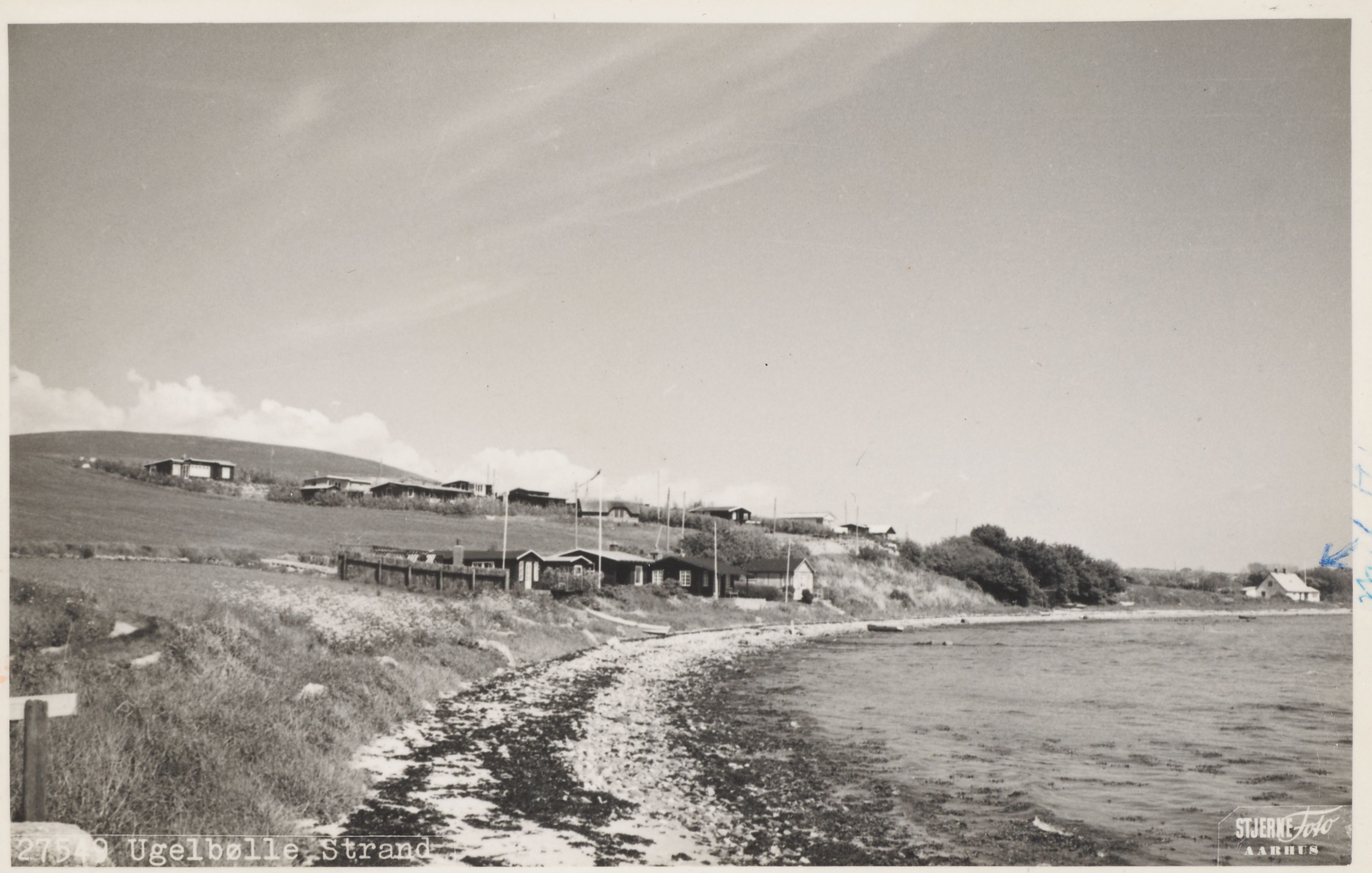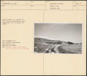 Maskingenkendt tekst fra arkivkort. Huset yderst til højre er fru Johanne Rasmussens barn- domshjem. Det er bygget år 1899. Foto skænket af: Fru Johanne Rasmussen, Strandvejen lo, Øgelbølle, Rønde. SE: Brevj. i neu. 34/74 samt opt. om Indbo neu nr. 50,590