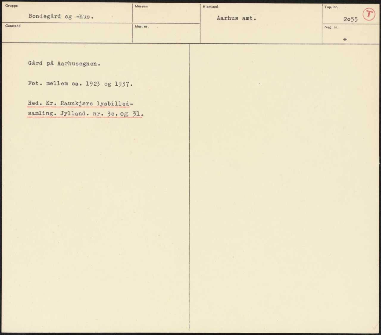 Maskingenkendt tekst fra arkivkort. Gård på Aarhusegnen. Fot. mellem ca. 1925 og 1937. Red. Kr. Raunkjærs lysbilled- samling. Jylland. nr. 30. og 31.