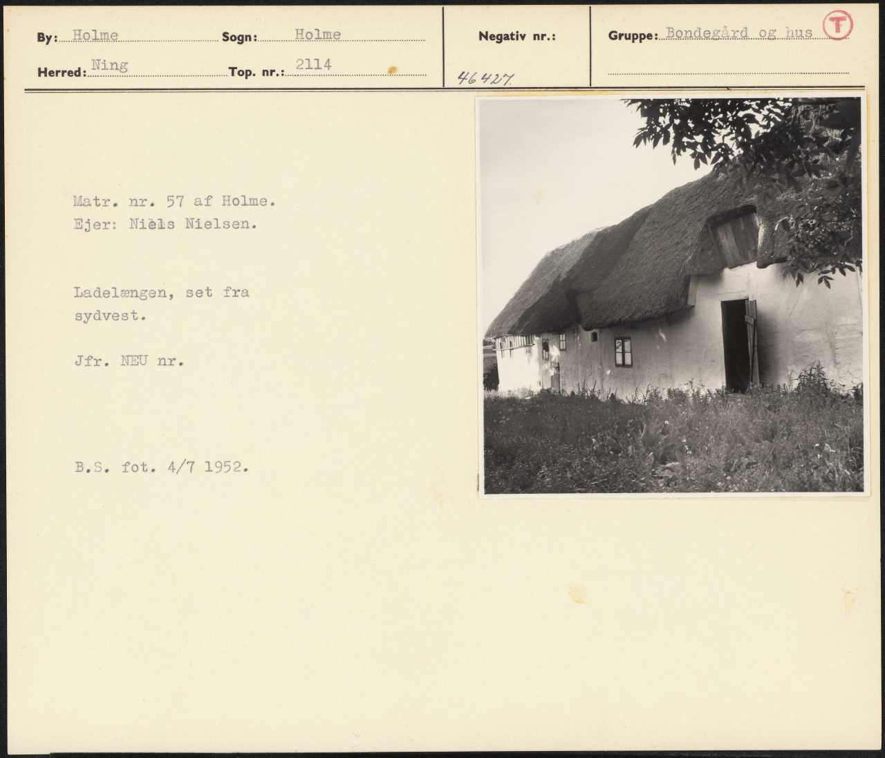 Maskingenkendt tekst fra arkivkort. Matr. nr. 57 af Holme. Ejer: Niels Nielsen. Ladelængen, set fra sydvest. Jfr. NEU nr. B.S. fot. 4/T 1952.
