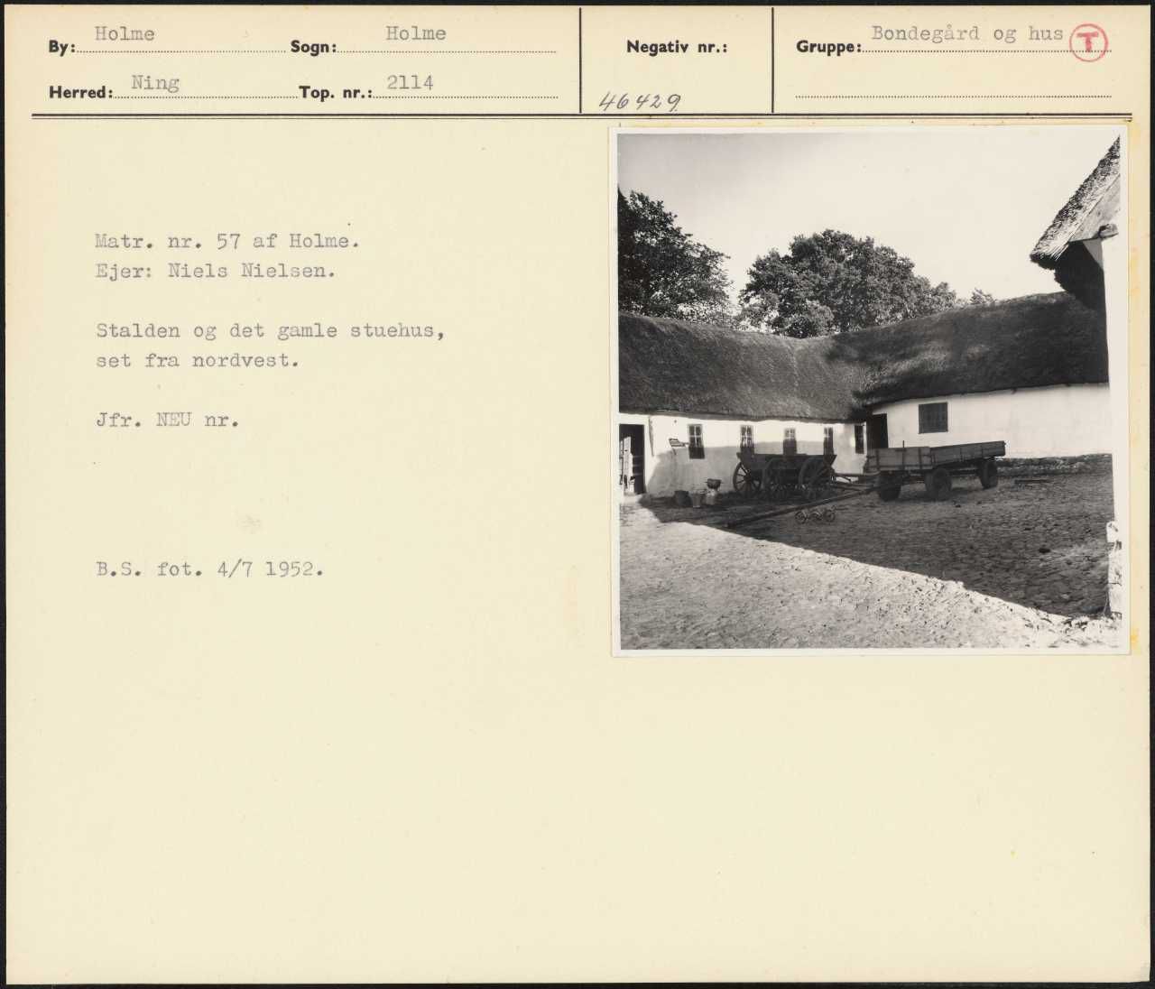 Maskingenkendt tekst fra arkivkort. Matr. nr. 57 af Holme. Ejer: Niels Nielsen. Stalden og det gamle stuehus, set fra nordvest. Jfr. NEU nr. B.S. fot. 4/7 1952.
