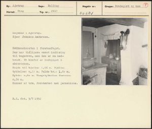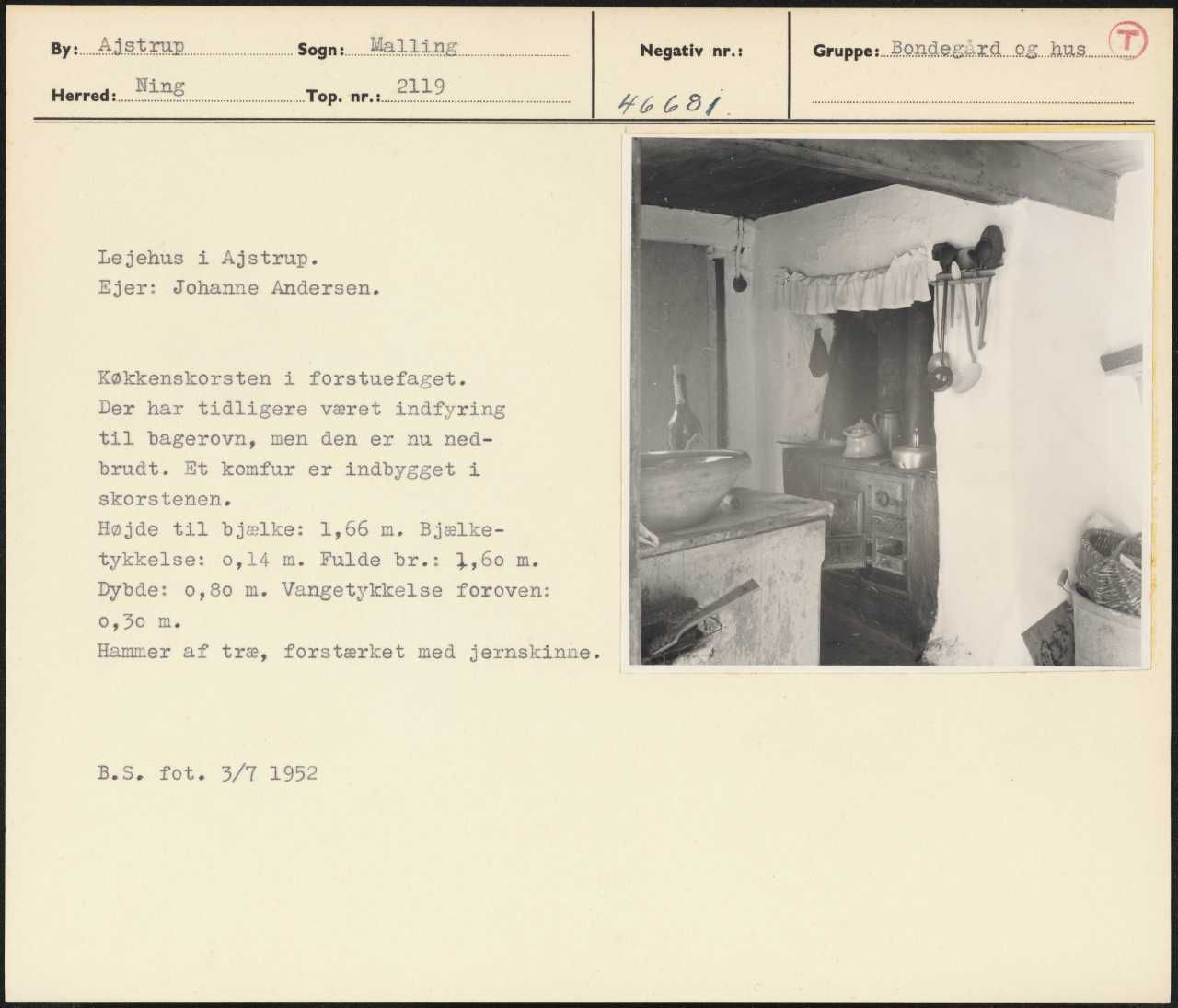 Maskingenkendt tekst fra arkivkort. Lejehus i Ajstrup. Ejer: Johanne Andersen. Køkkenskorsten i forstuefaget. Der har tidligere været indfyring til bagerovn, men den er nu ned- brudt. Et komfur er indbygget 1 skorstenen. Højde til bjælke: 1,66 m. Bjælke- tykkelse: 0,14 m. Fulde br: J,60 m. Dybde: 0,80 m. Vangetykkelse foroven: 0,30 m. Hammer af træ, forstærket med jernskinne. B.S. fot. 3/T 1952