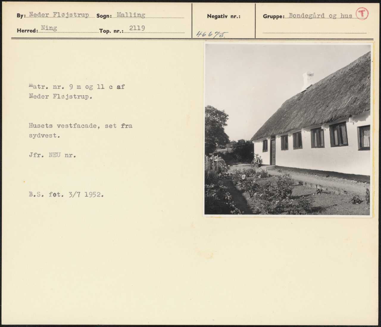 Maskingenkendt tekst fra arkivkort. Matr, nr. 9 m og 11 ec af Neder Fløjstrup. Husets vestfacade, set fra sydvest. Jfr. NEU nr. B.S. fet. 3/T 1952.