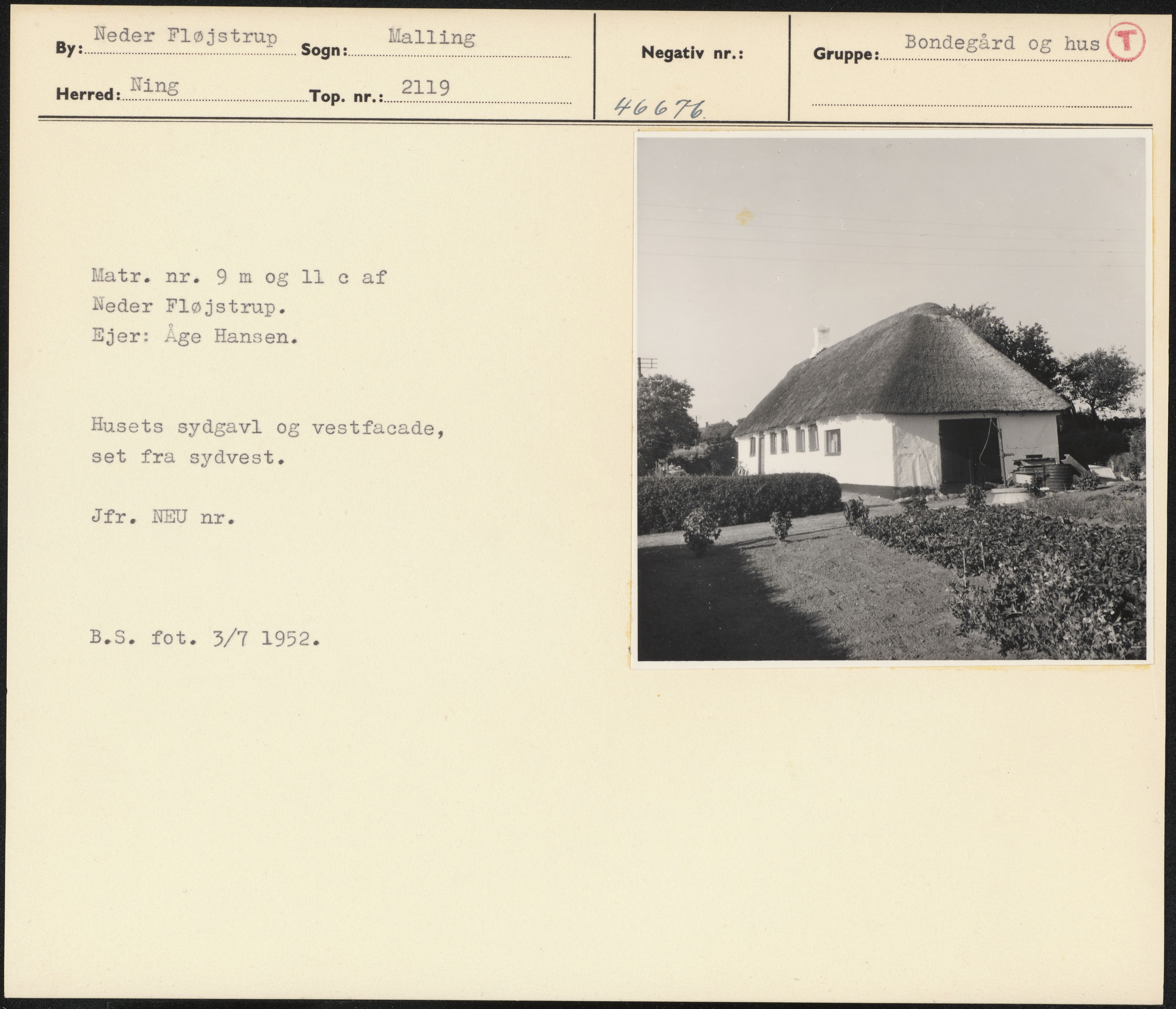 Maskingenkendt tekst fra arkivkort. Matr. nr. 9 m og 11 e af Neder Fløjstrup. Ejer: Åge Hansen. Husets sydgavl og vestfacade, set fra sydvest- Jfr. NEU nr. B.S. fot. 3/7 1952.