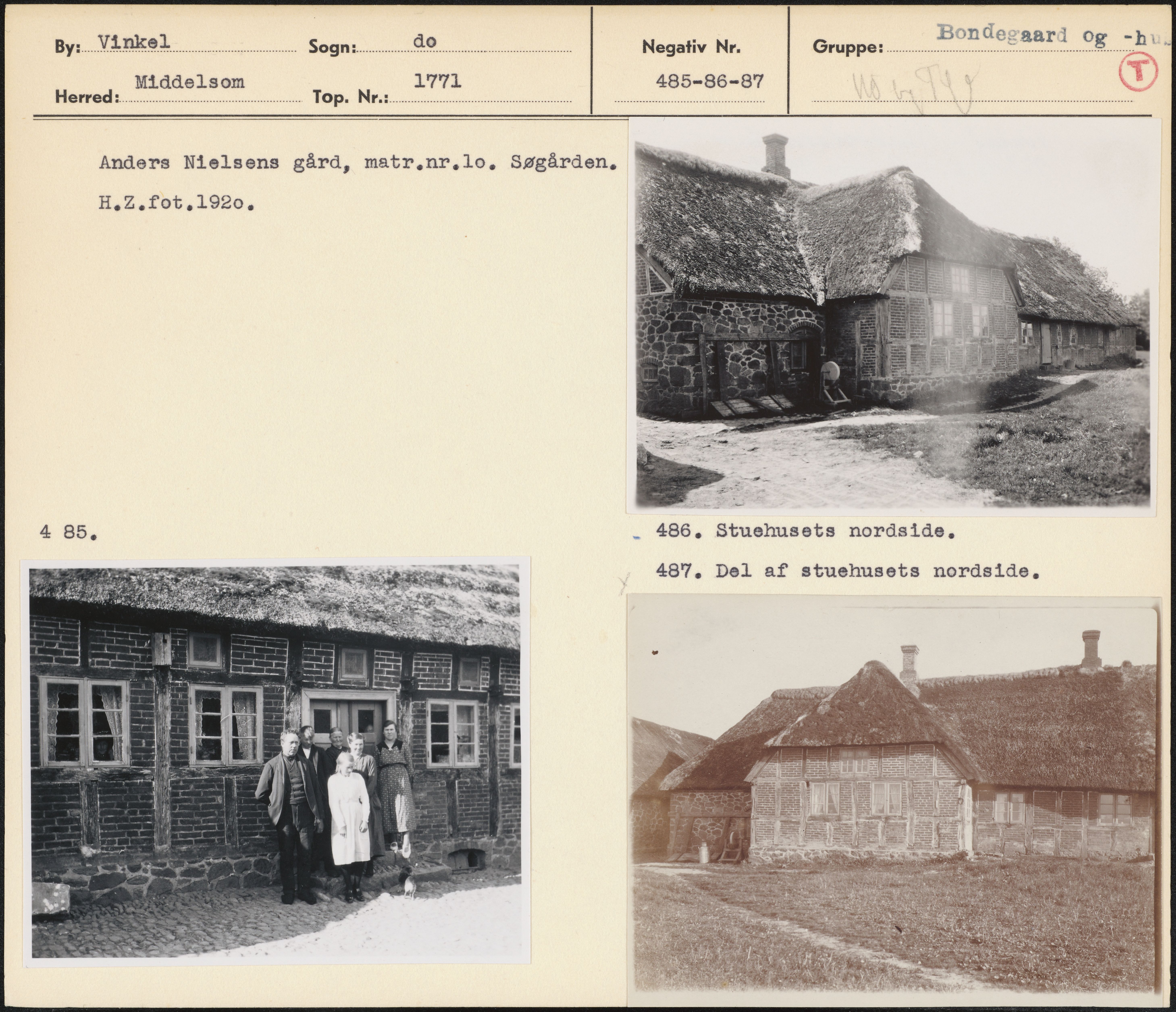 Maskingenkendt tekst fra arkivkort. Anders Nielsens gård, matr.nr.lo, Søgården, i. æ H.Z.fot,1920. 4 85- 486, Stuehusets nordside,