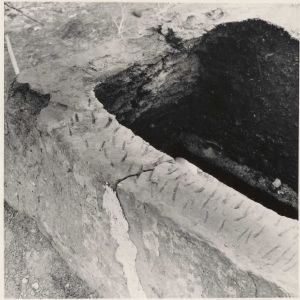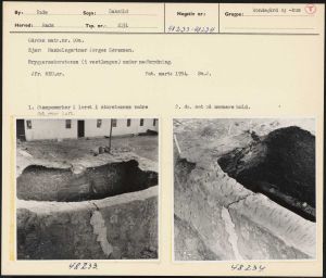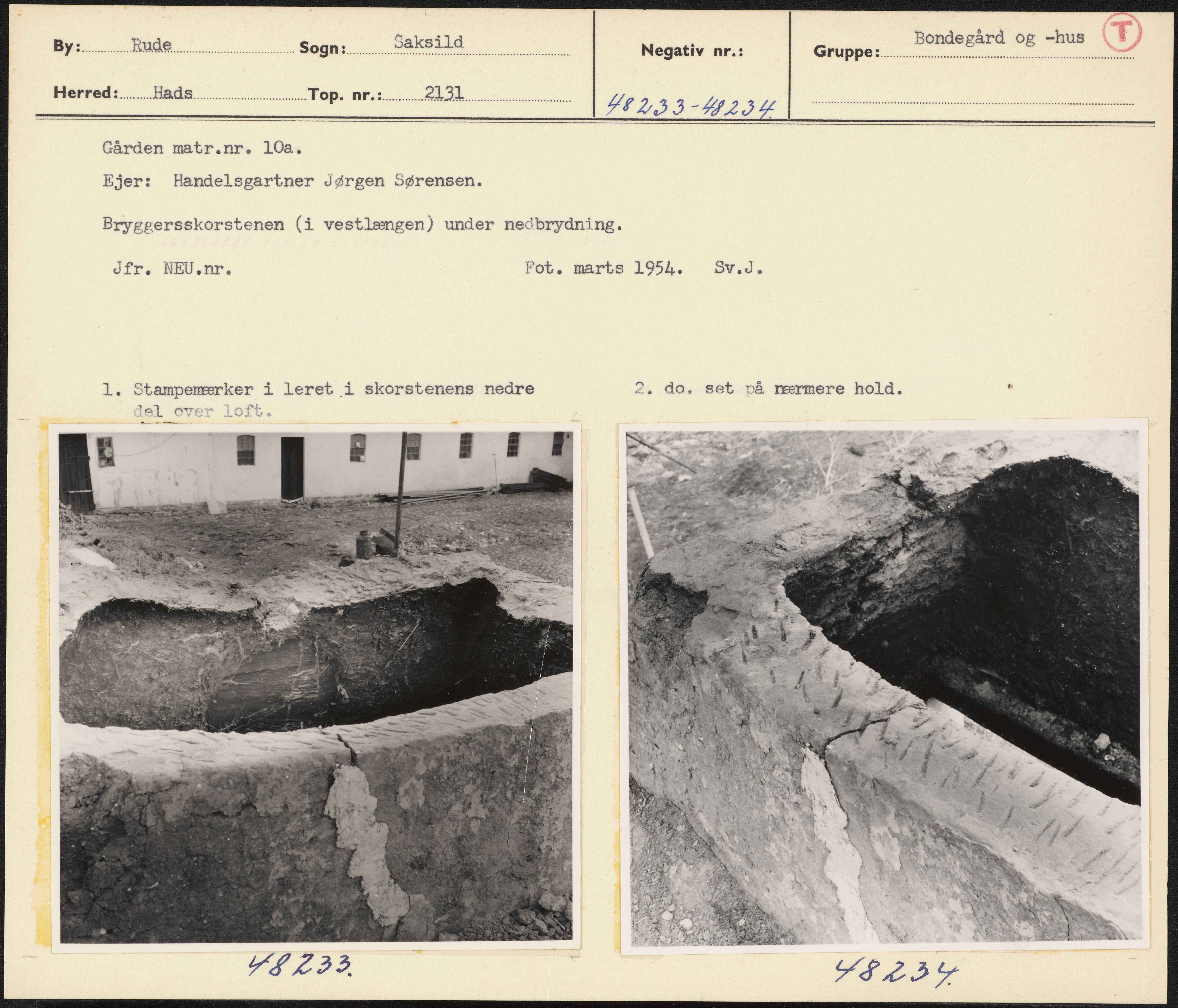 Maskingenkendt tekst fra arkivkort. Gården matr.nr. 10a. Ejer: Handelsgartner Jørgen Sørensen. Bryggersskorstenen (i vestlængen) under nedbrydning. Jfr. NEU.nr. Fot. marts 1954. —5Sv.J. 1. Stamperærker i leret i skorstenens nedre 2. do, set vå rærmere hold. AL mernon Tom 4 v&8K22, AFL