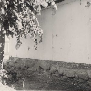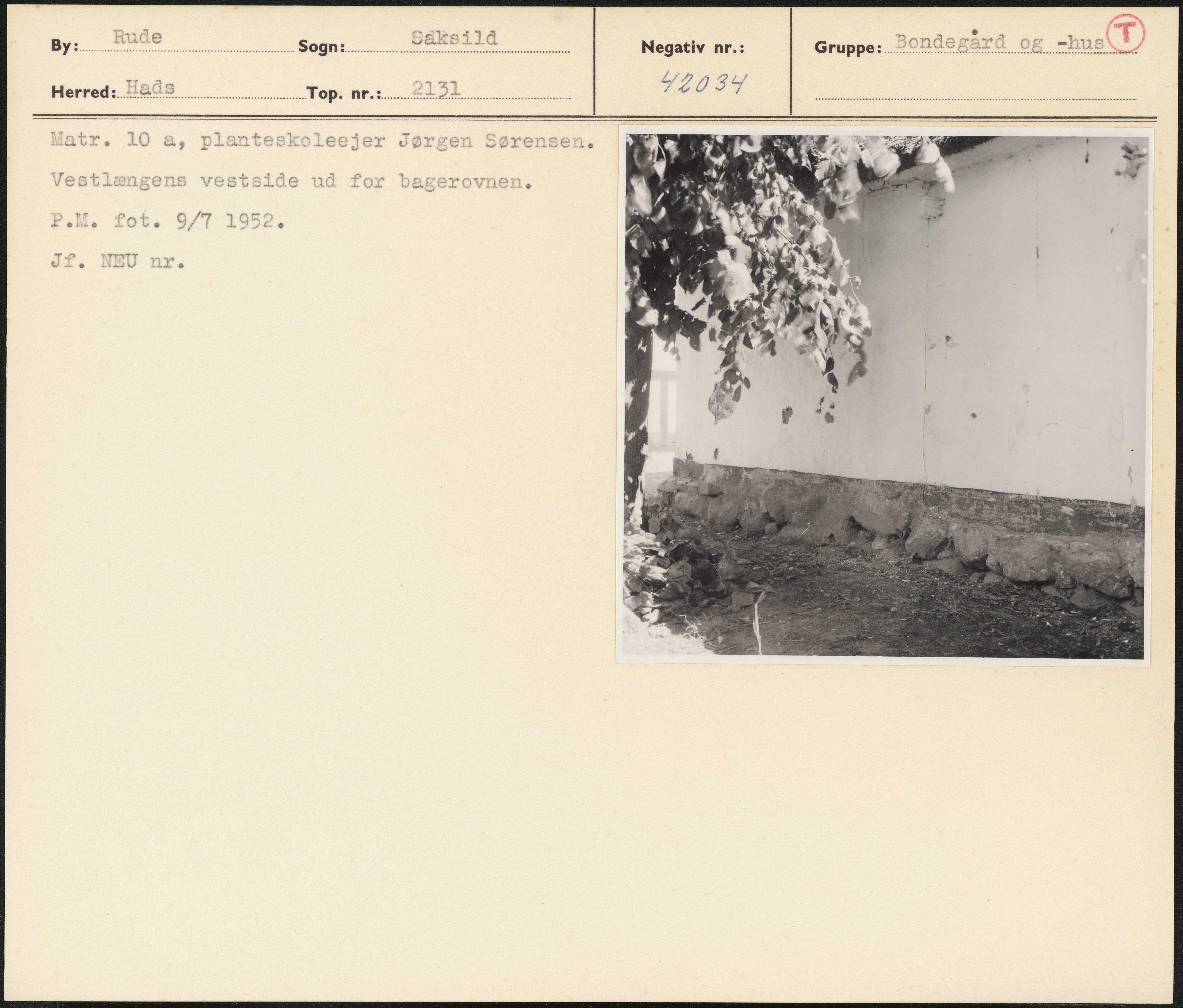 Maskingenkendt tekst fra arkivkort. Matr. 10 a, planteskoleejer Jørgen Sørensen. Vestlængens vestside ud for bagerovnen. P.M. fot. 9/7 1952. Jf. NEU nr.