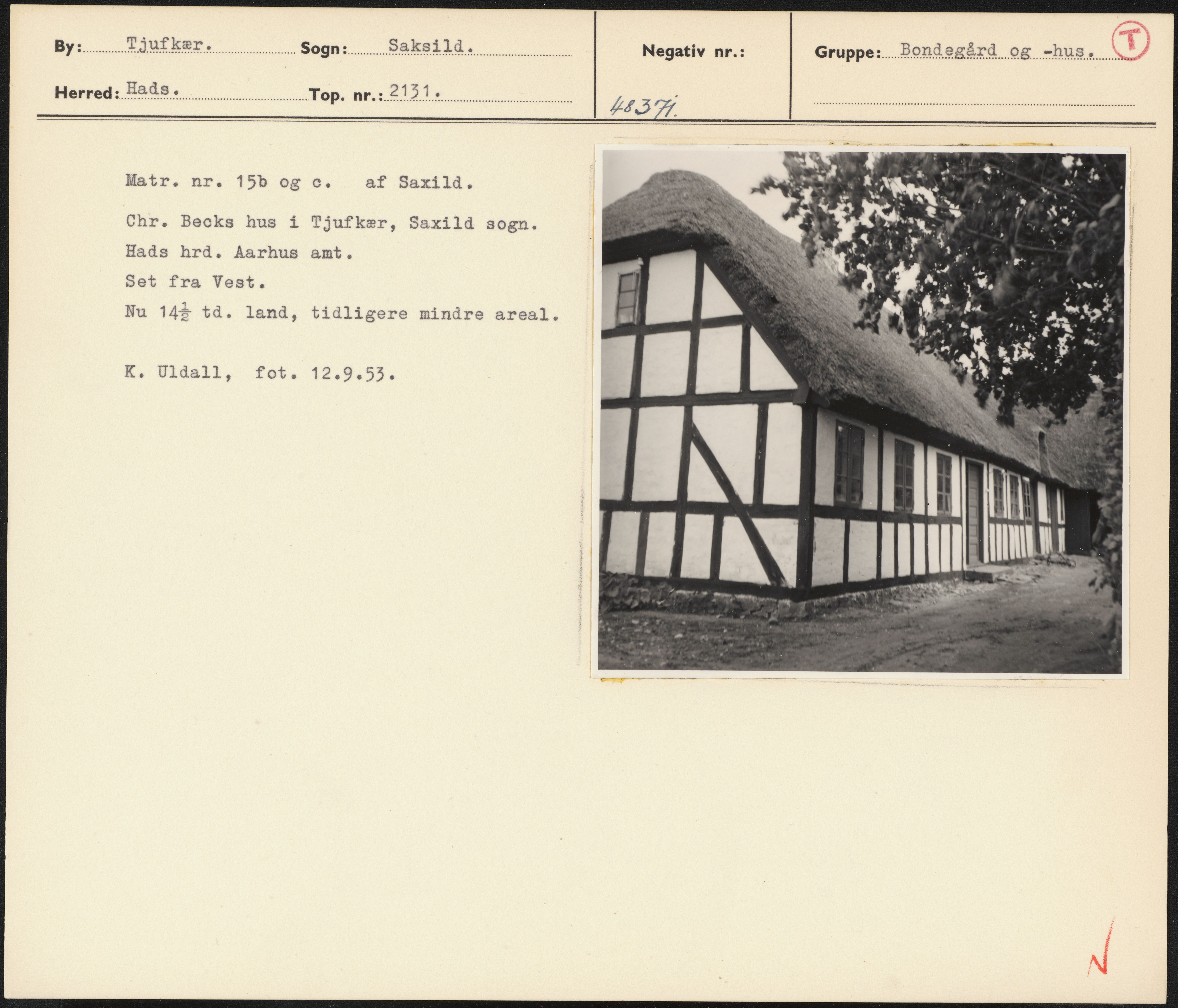 Maskingenkendt tekst fra arkivkort. Matr. nr. 15b og c. af Saxild. Chr. Becks hus i Tjufkær, Saxild sogn. Hads hrd. Aarhus amt. Set fra Vest. Nu 144 td. land, tidligere mindre areal. K. Uldall, fot. 12.9.53.