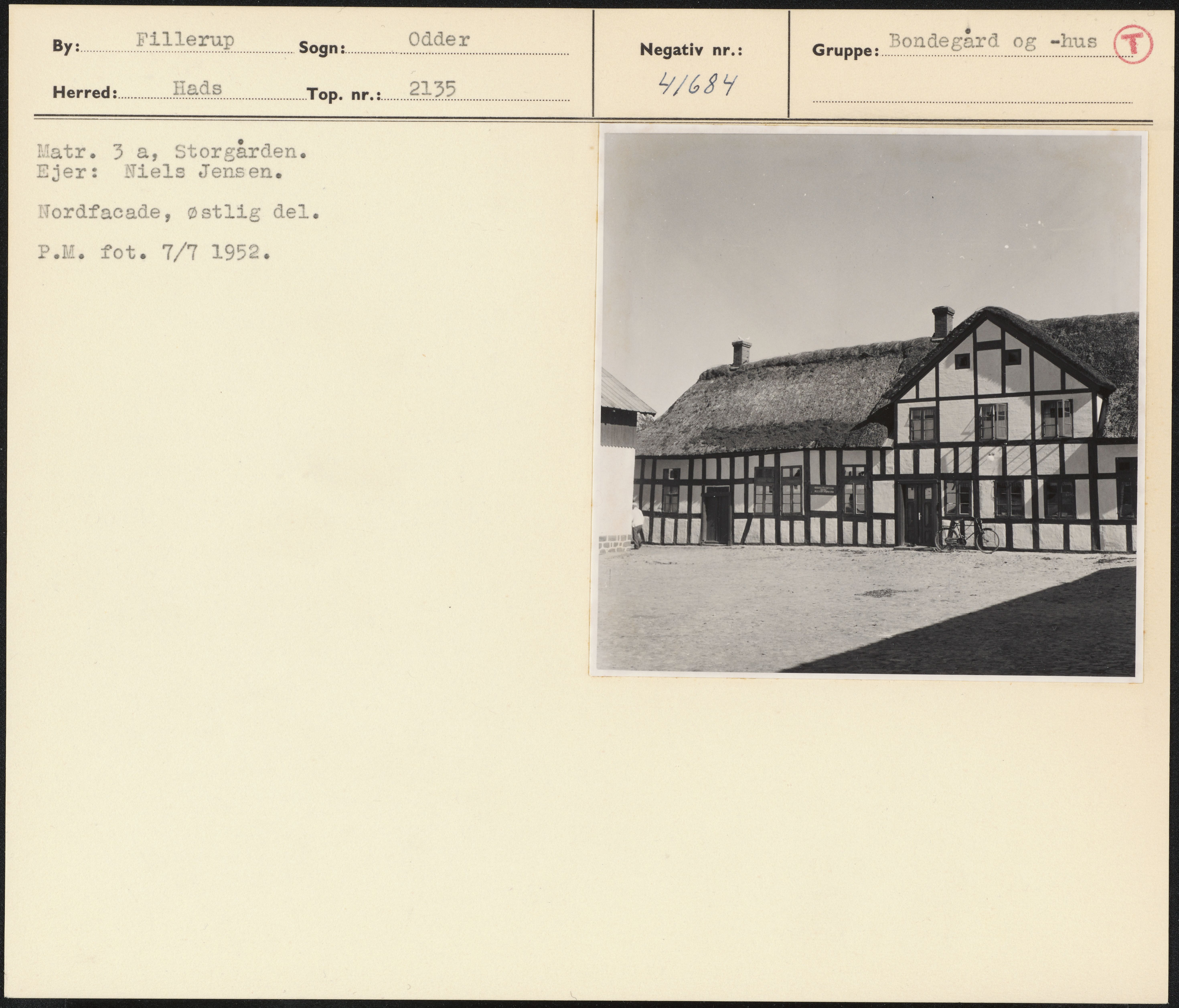 Maskingenkendt tekst fra arkivkort. Matr. 3 a, Storgården. Ejer: Niels Jensen. Nordfacade, østlig del. P.M. fot. 7/7 1952.