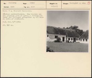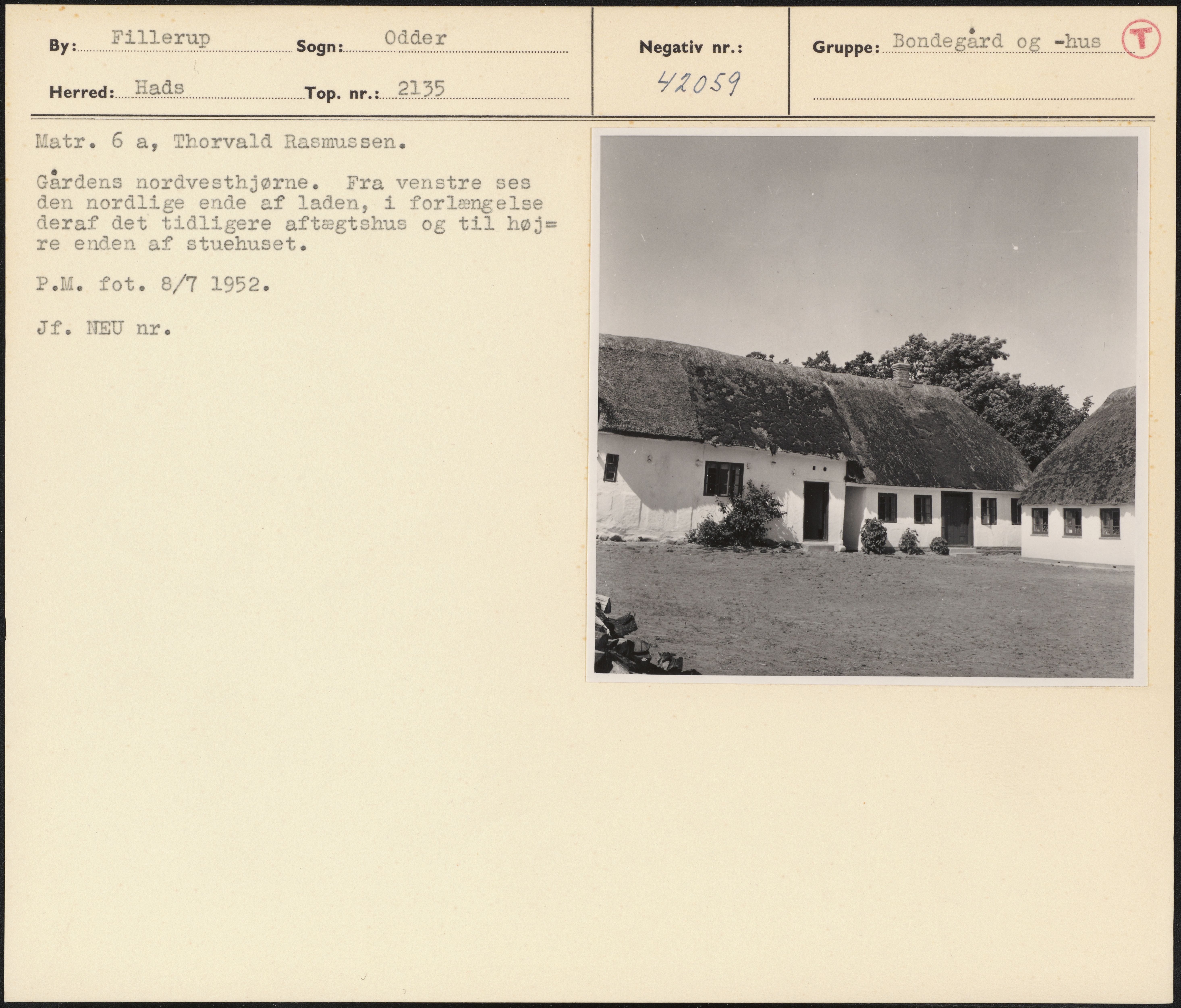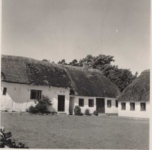Maskingenkendt tekst fra arkivkort. Matr. 6 a, Thorvald Rasmussen. Gårdens norådvesthjørne. Fra venstre ses den nordlige ende af laden, i forlængelse deraf det tidligere aftægtshus og til høj= re enden af stuehuset. P.M. fot. 8/7 1952: Jf. NEU nr.