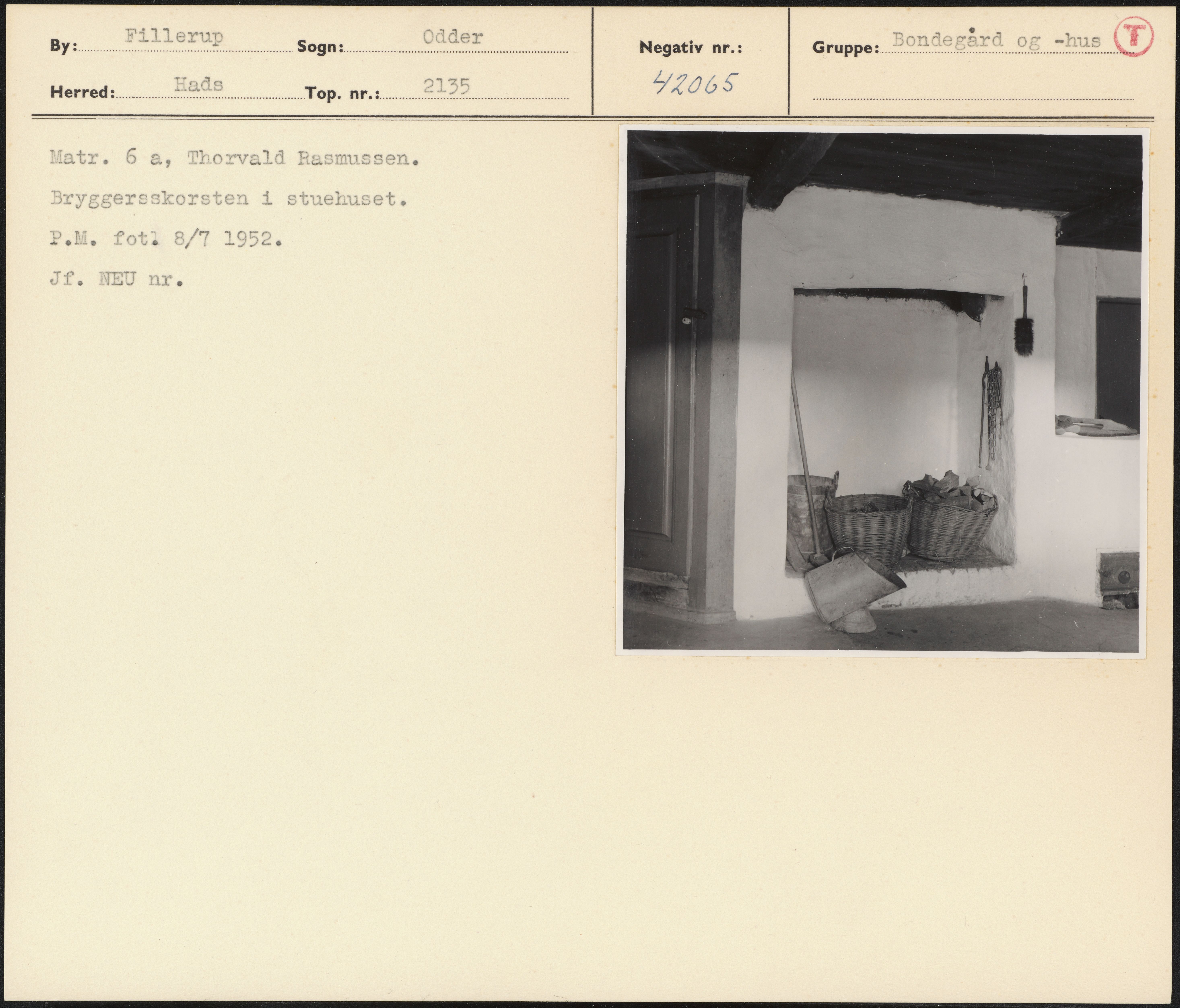 Maskingenkendt tekst fra arkivkort. Matr. 6 a, Thorvald Rasmussen. Bryggersskorsten i stueluset. P.M. foti 8/7 1952. Jf. NEU nr.