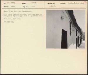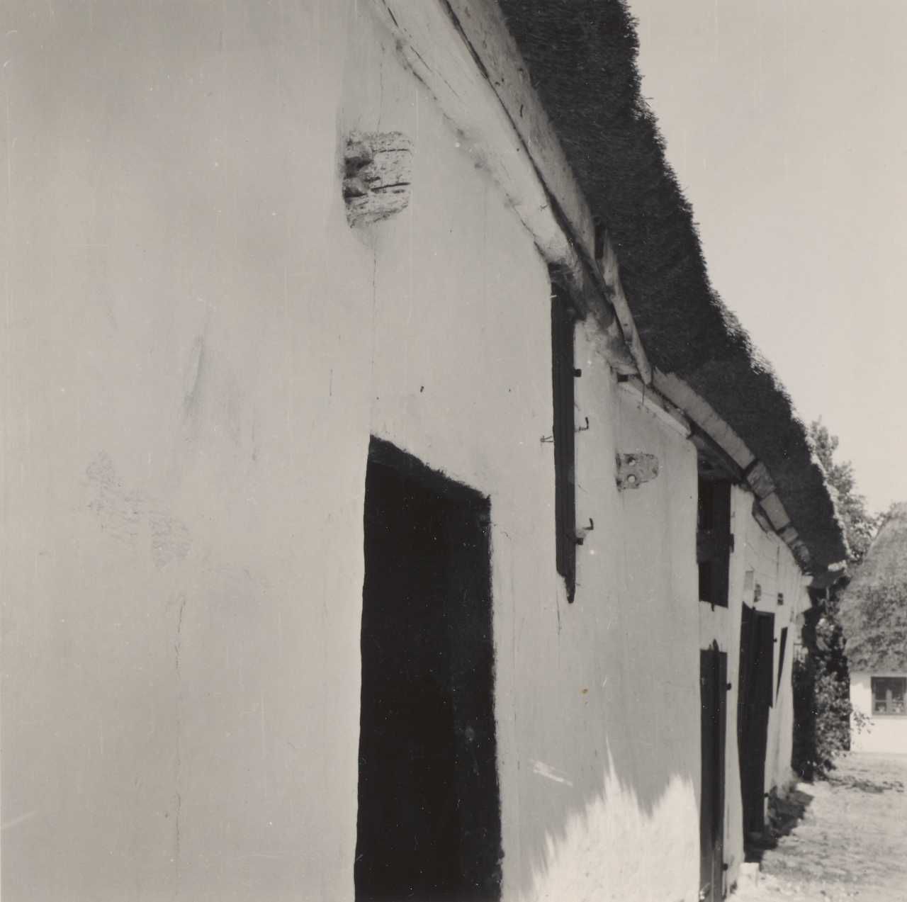 Maskingenkendt tekst fra arkivkort. Matr. 6 a, Thorvald Rasmussen. Kik langs ladens østside, hvor man ser de udragende bjælketappe med to splitter hver. P.M. fot. 8/7 1952. Jf. NEU nr.