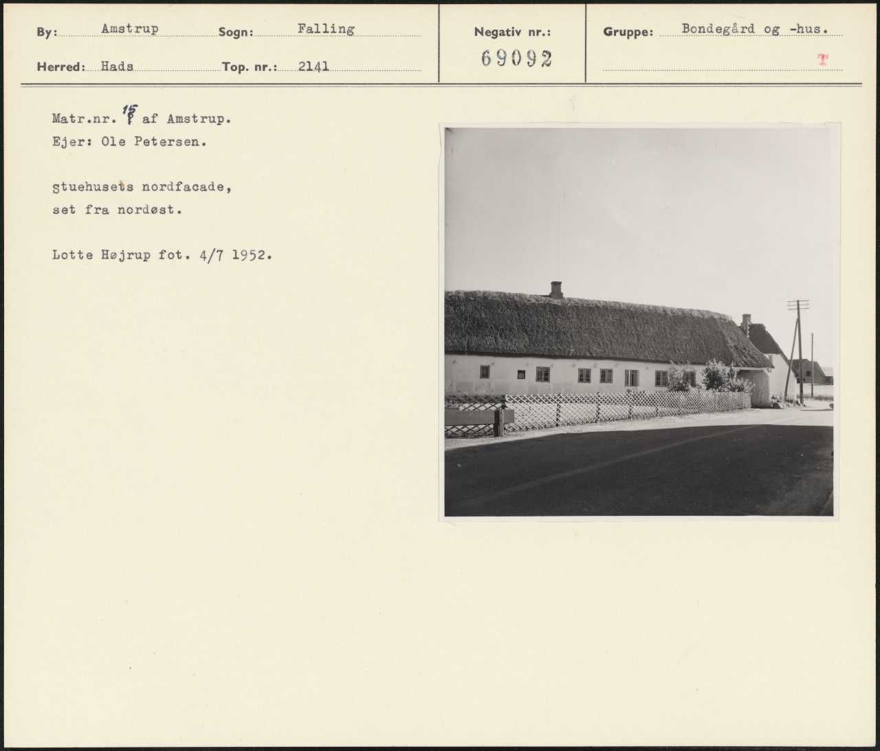 Maskingenkendt tekst fra arkivkort. Matr.nr' af Amstrup. Ejer: Ole Petersen. stuehuseds nordfacade, set fra nordøst. Lotte Højrup fot. 4/7 1952.