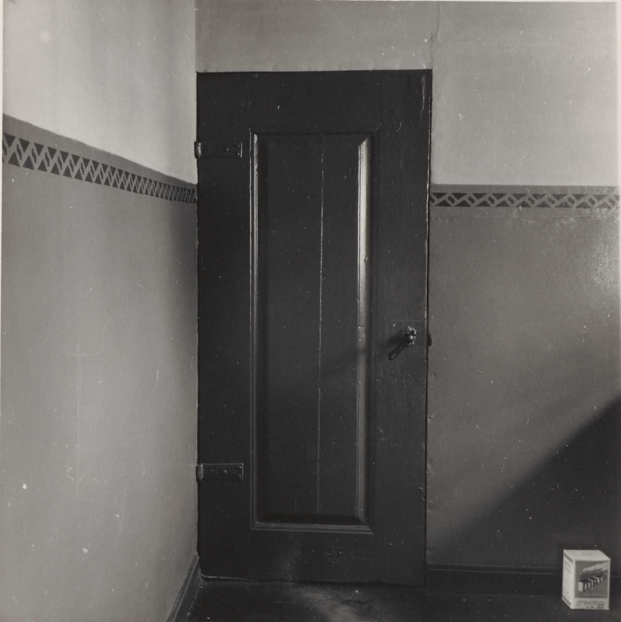 Maskingenkendt tekst fra arkivkort. Matr.nr. 9a af Amstrup. Ejer: Anton Andersen. Dør mellem køkken og dagligstue, set fra køkken, Maling chokoladefarvet, ingen karm. Højde: 158 cm. Bredde: 71 " Lotte Højrup fot. 4/7 1952.