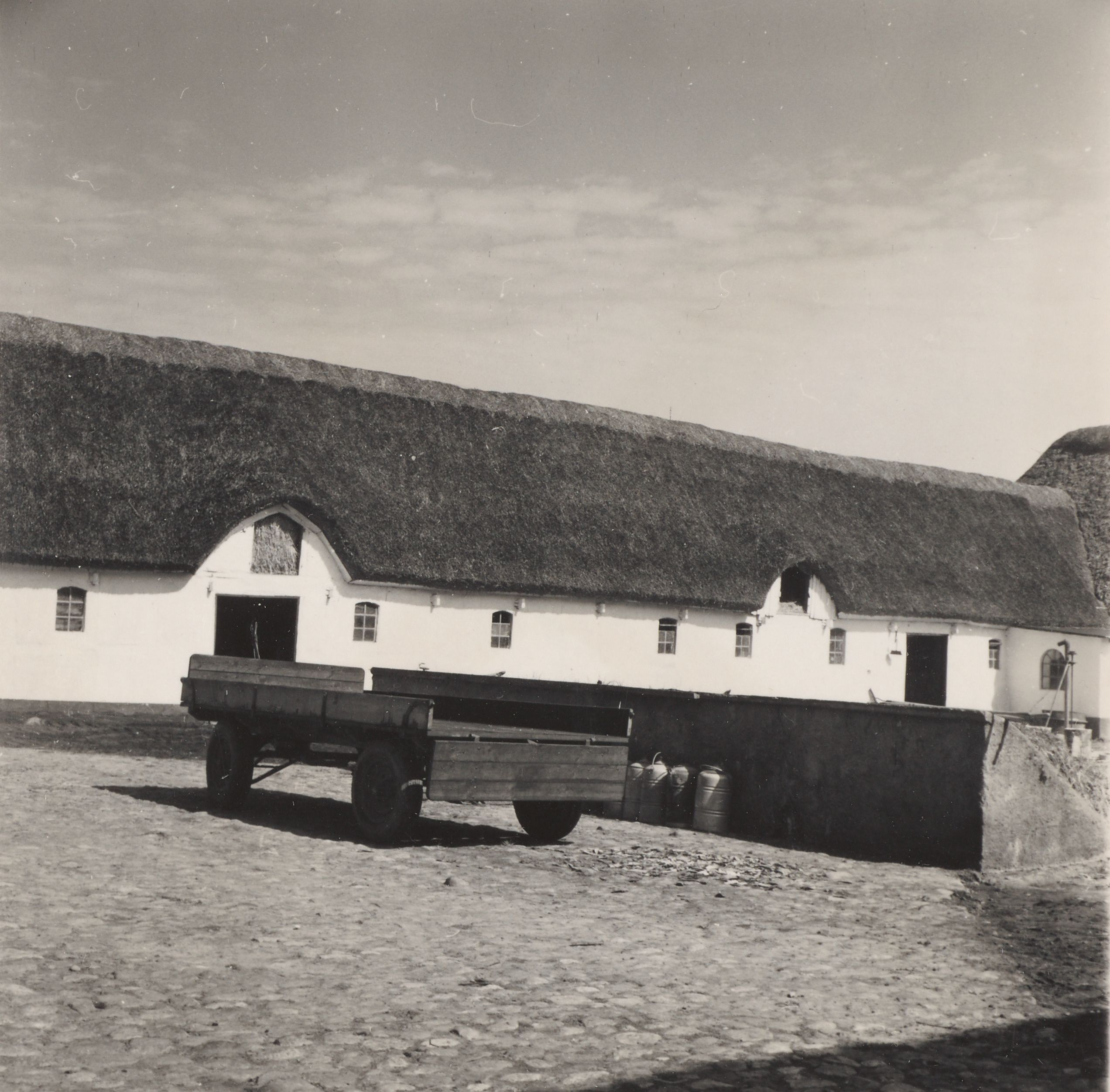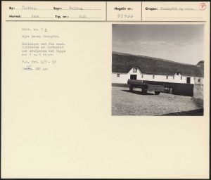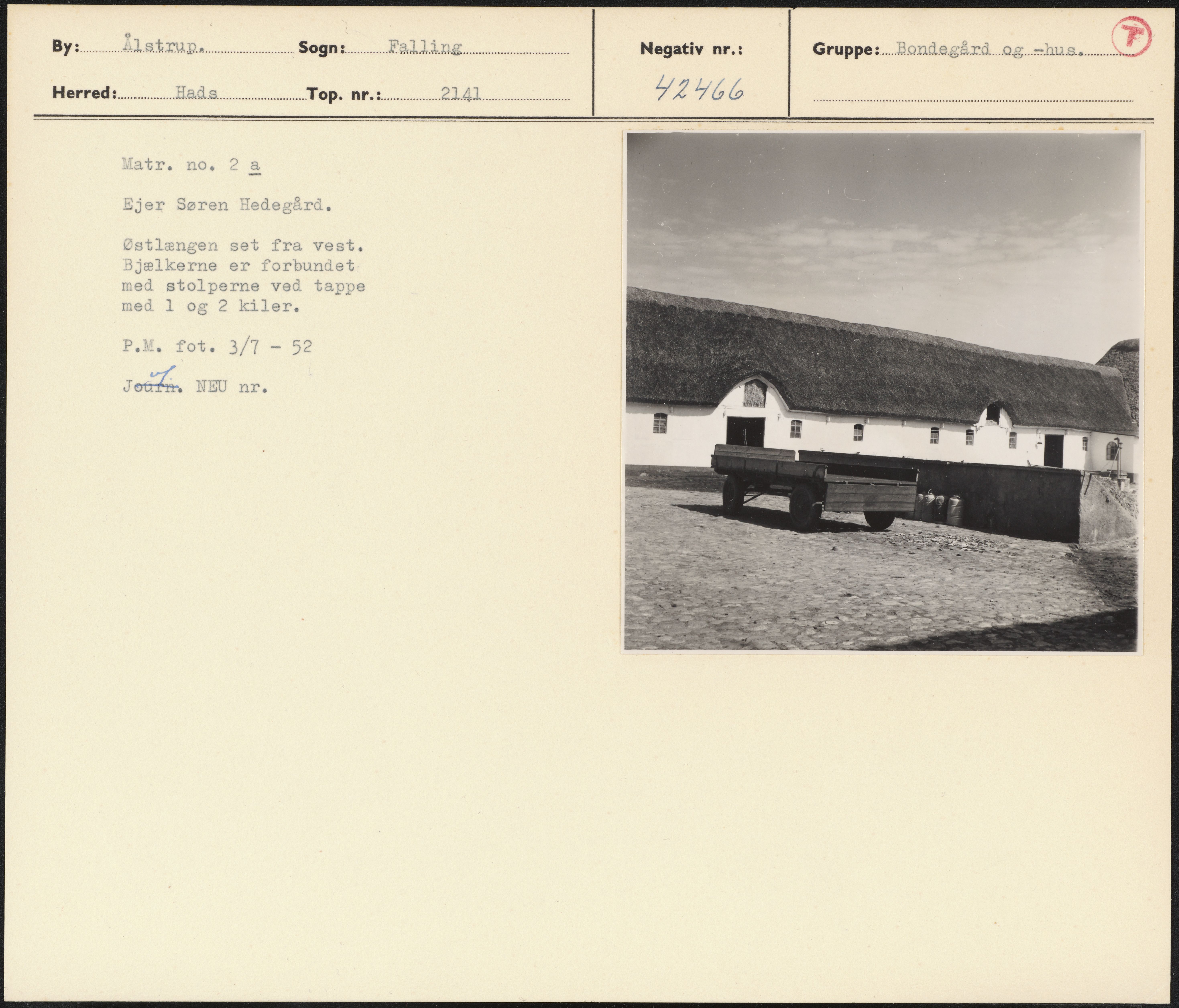 Maskingenkendt tekst fra arkivkort. Matr. no. 2 a Ejer Søren Hedegård. Østlængen set fra vest. Bjælkerne er forbundet med stolperne ved tappe med 1 og 2? kiler. P.M. fot. 3/7 - 52 Jod. NEU nre ,