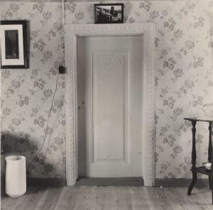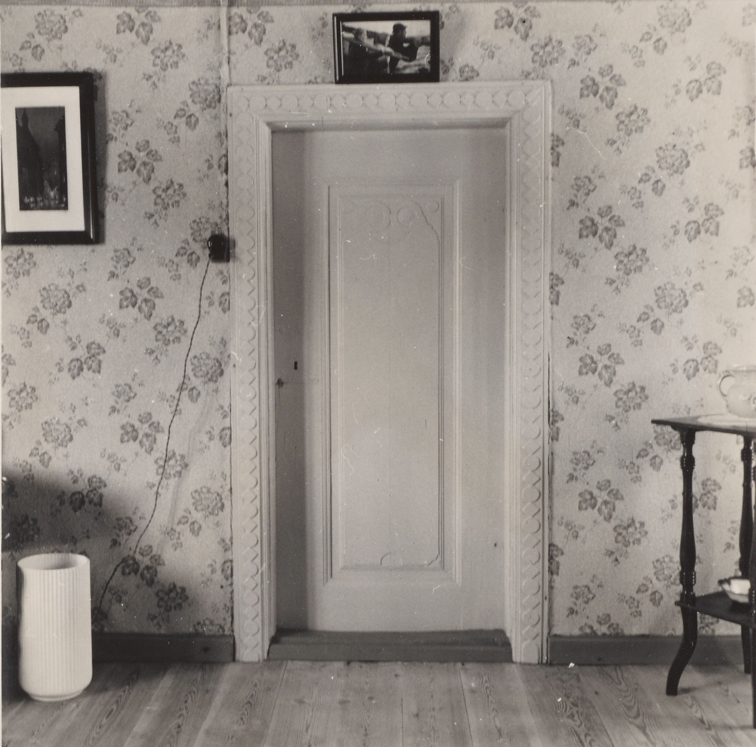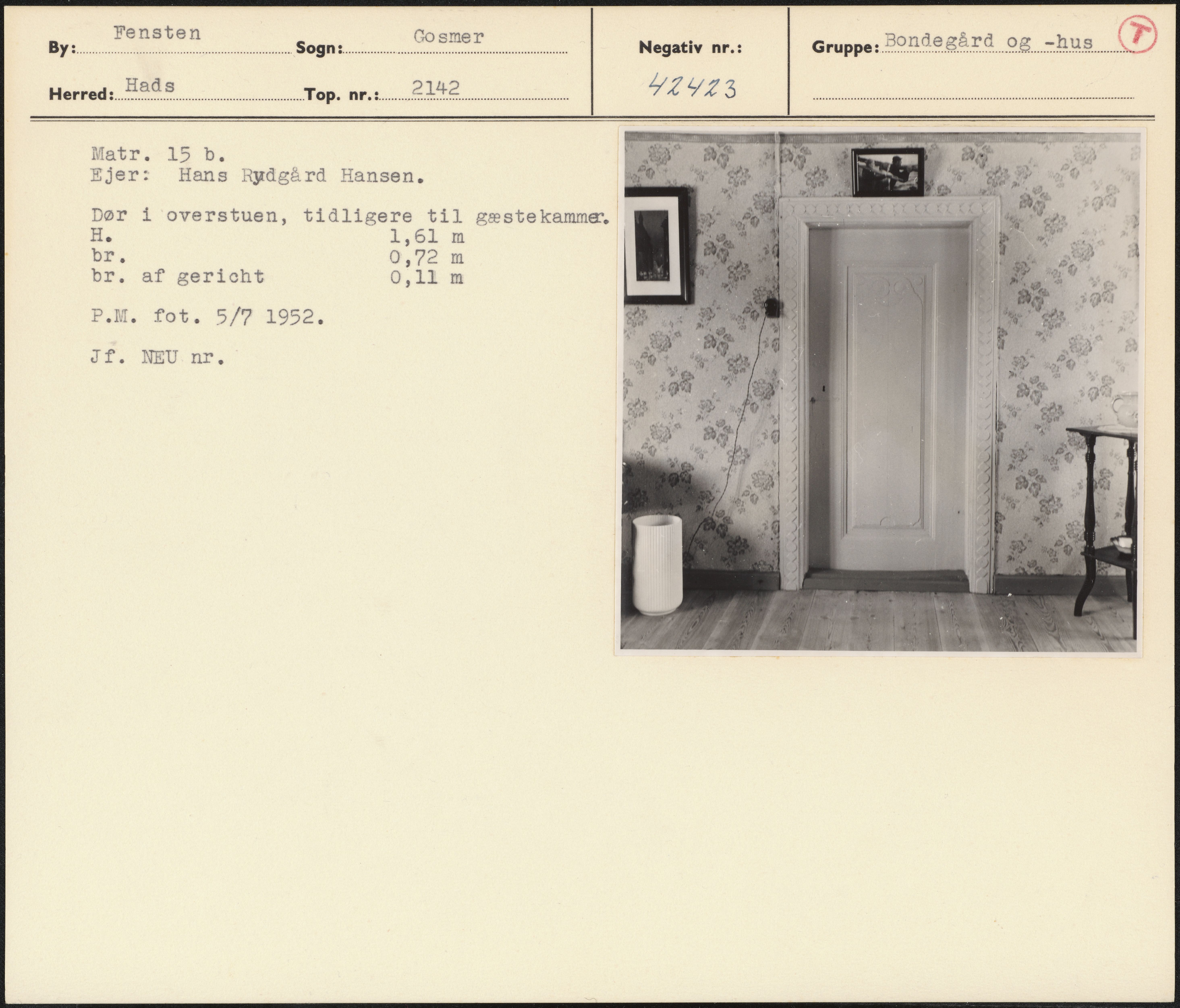 Maskingenkendt tekst fra arkivkort. Matr. 15 b. Ejer: Hans Rydgård Hansen. Dør i overstuen, tidligere til gæstekammer, H. 1,61 m br. 0,72 m br. af gericht 0,11 m P.M. fot. 5/7 1952. Jf. NEU nr.