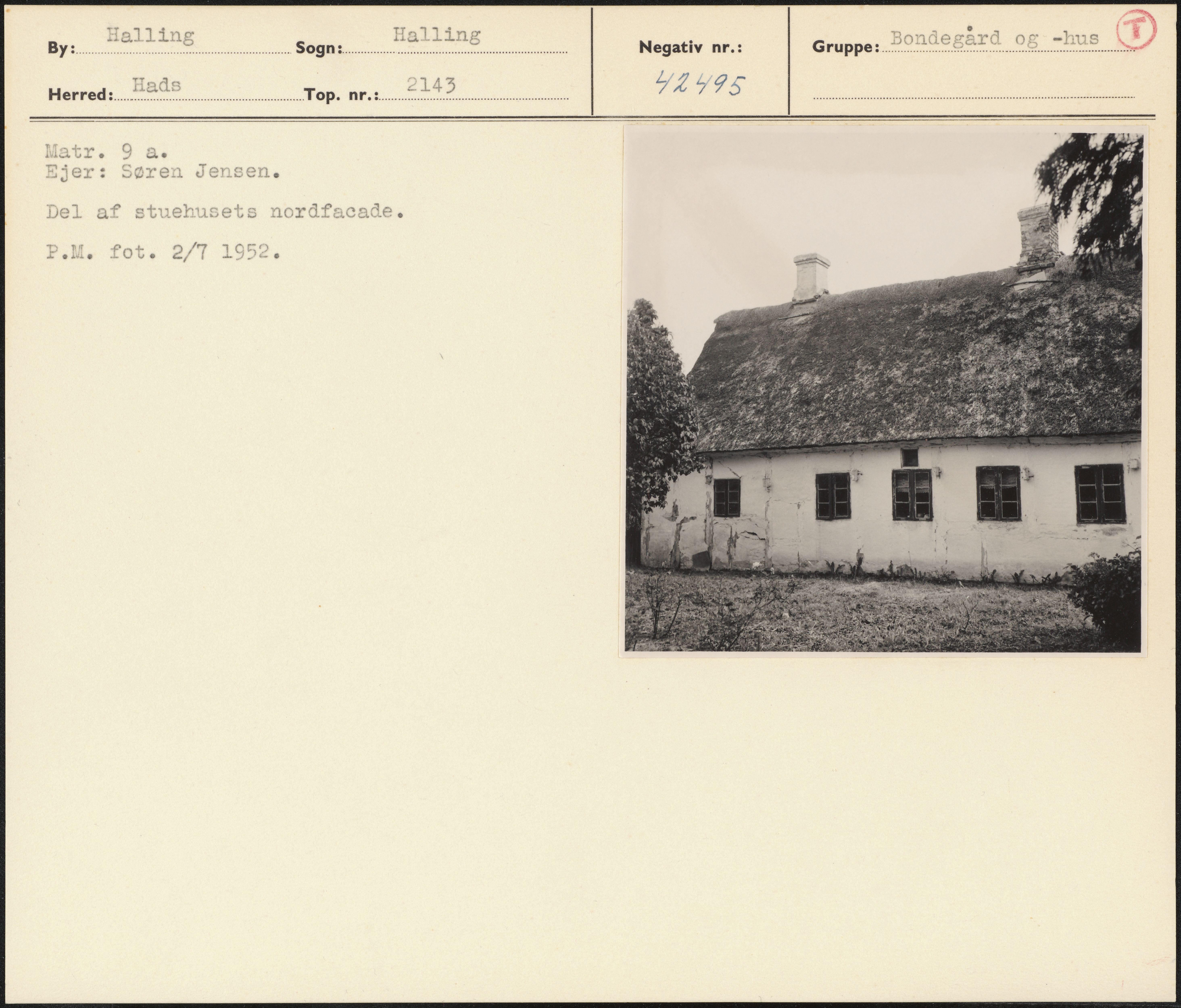 Maskingenkendt tekst fra arkivkort. Matr. 9 a. Ejer: Søren Jensen. Del af stuehusets nordfacade. P.M. fot. 2/7 1952.
