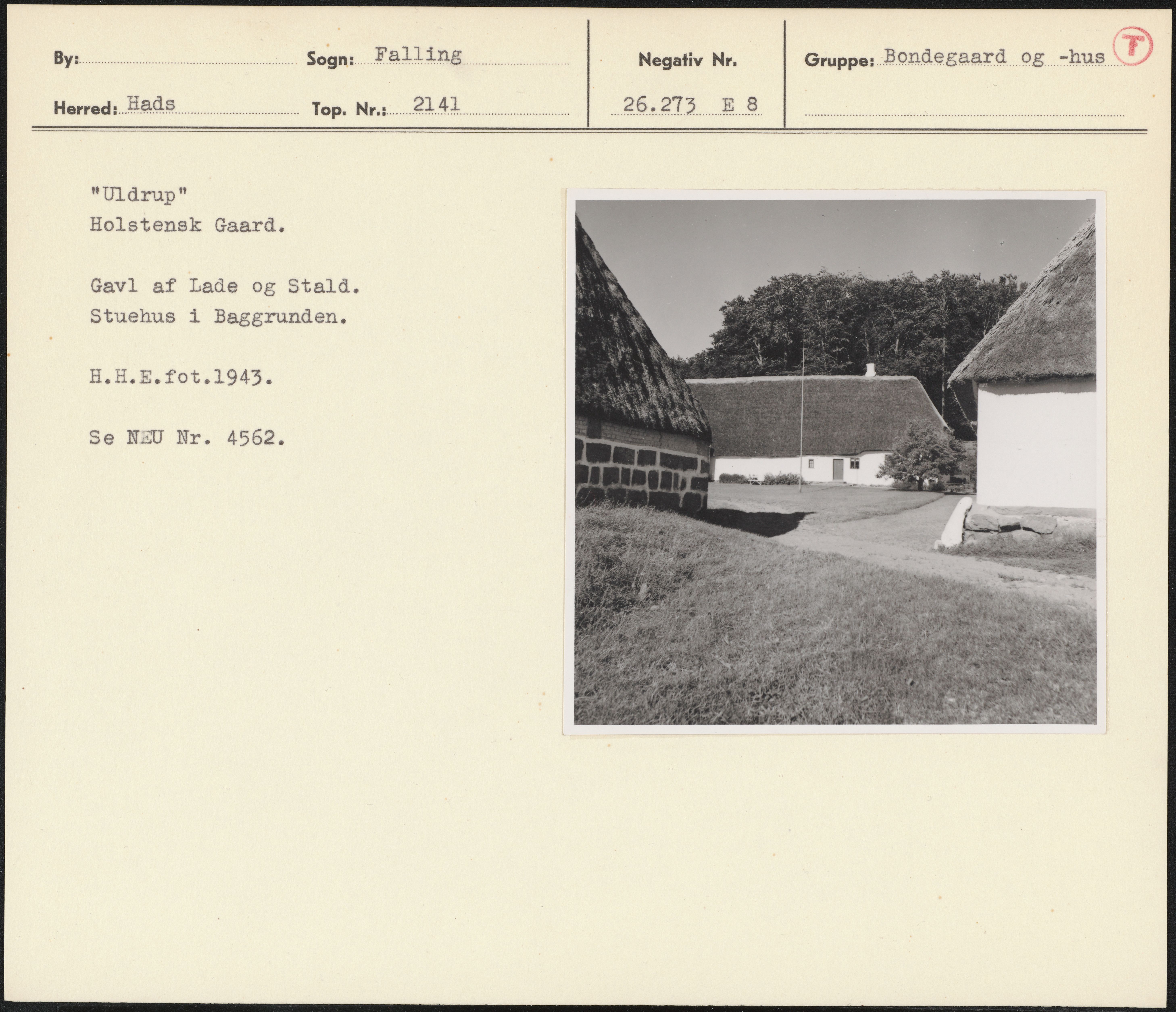 Maskingenkendt tekst fra arkivkort. Uldrup" Holstensk Gaard. Gavl af Lade og Stald. Stuehus i Baggrunden. H.H.E.fot.1943. Se NEU Nr. 4562.