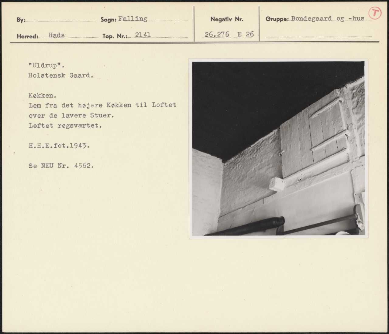Maskingenkendt tekst fra arkivkort. Uldrup". Holstensk Gaard. Køkken. Lem fra det højere Køkken til Loftet over de lavere Stuer. Leftet røgsværtet. . H.H.E.fot.1943. Se NEU Nr. 4562.