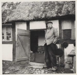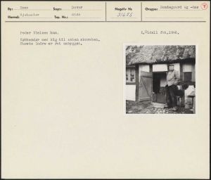 Maskingenkendt tekst fra arkivkort. Peder Nielsen hus. K.Uldall fot.1946. nn Køkkendør med klg til aaben skorsten, Husets indre er ret ombygget.
