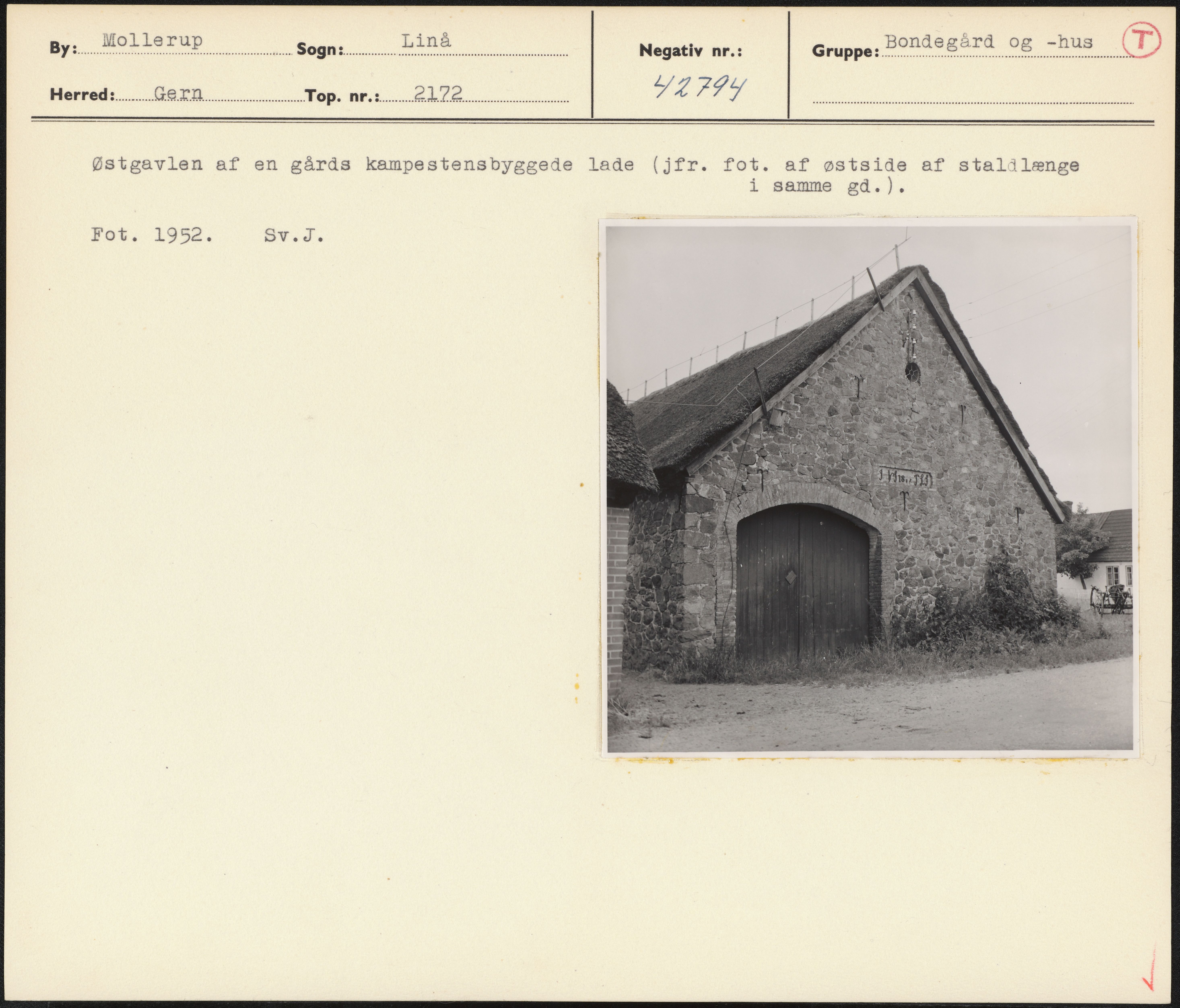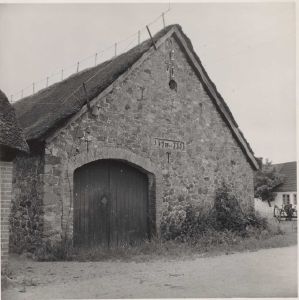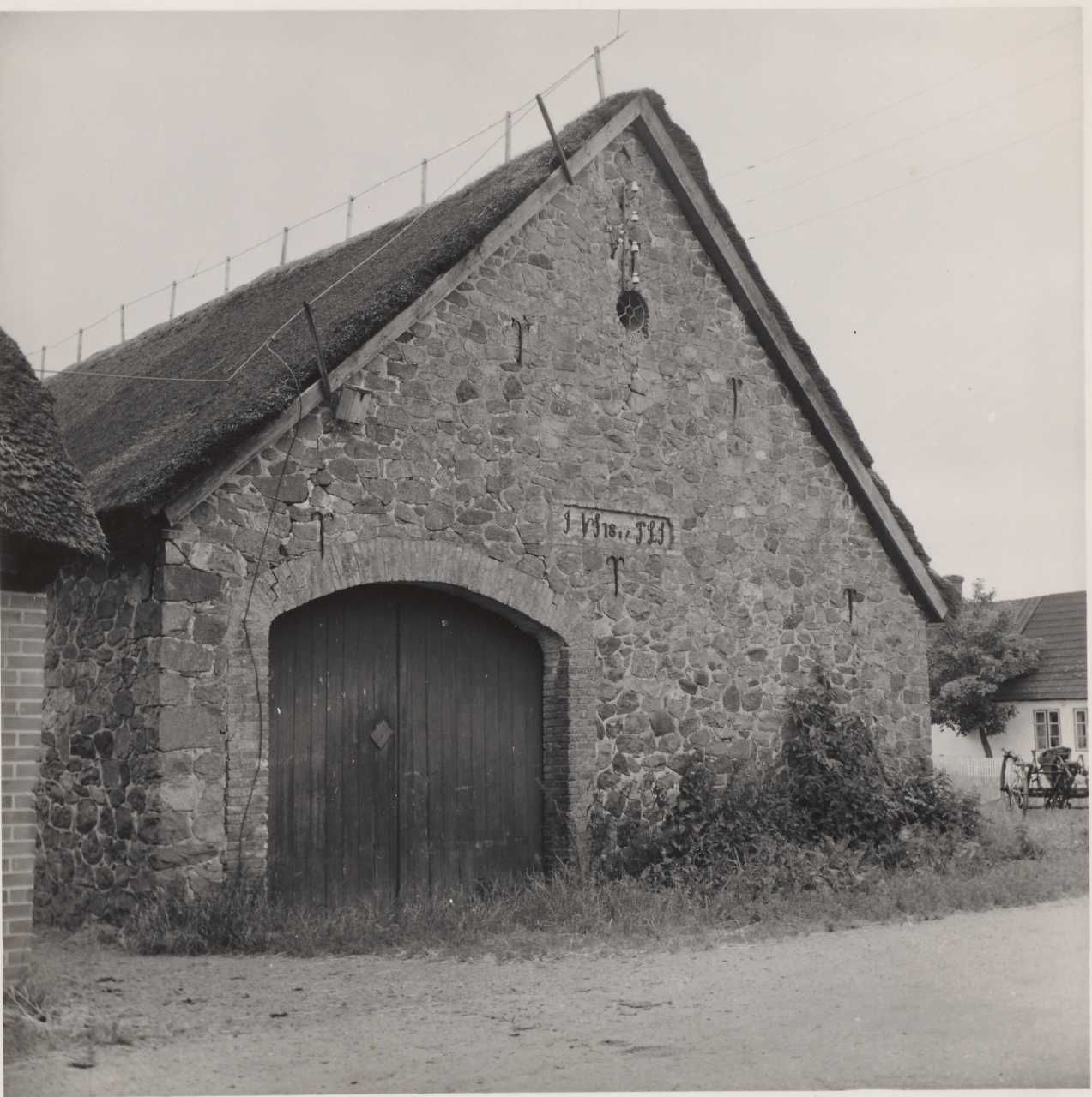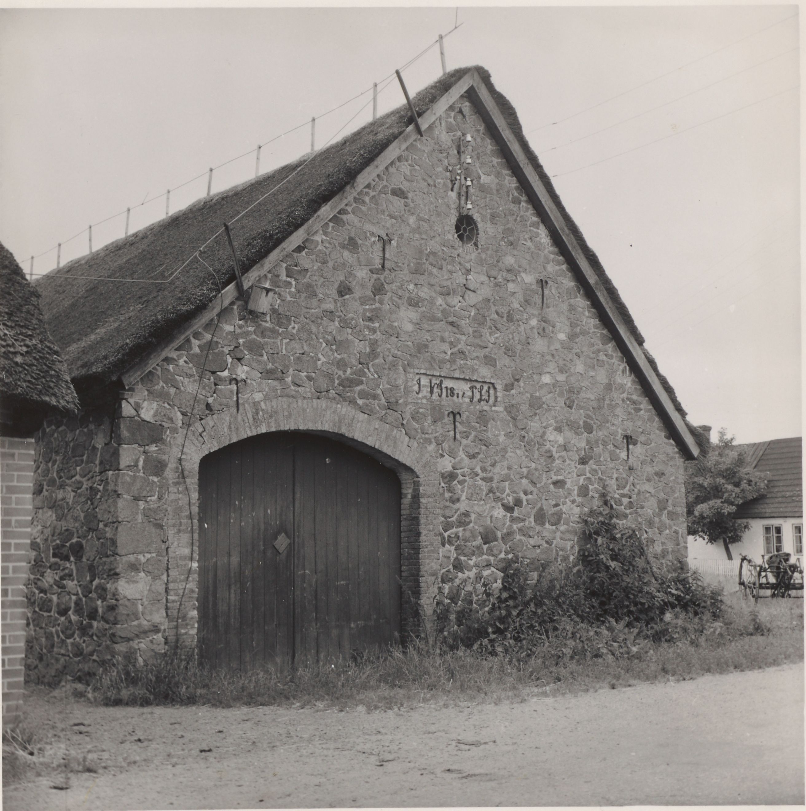 Maskingenkendt tekst fra arkivkort. stgavlen af en gårds kampestensbyggede lade (jfr. fot. af østside af stalilænge i samme gå). Fot. 1952. Sv.J.