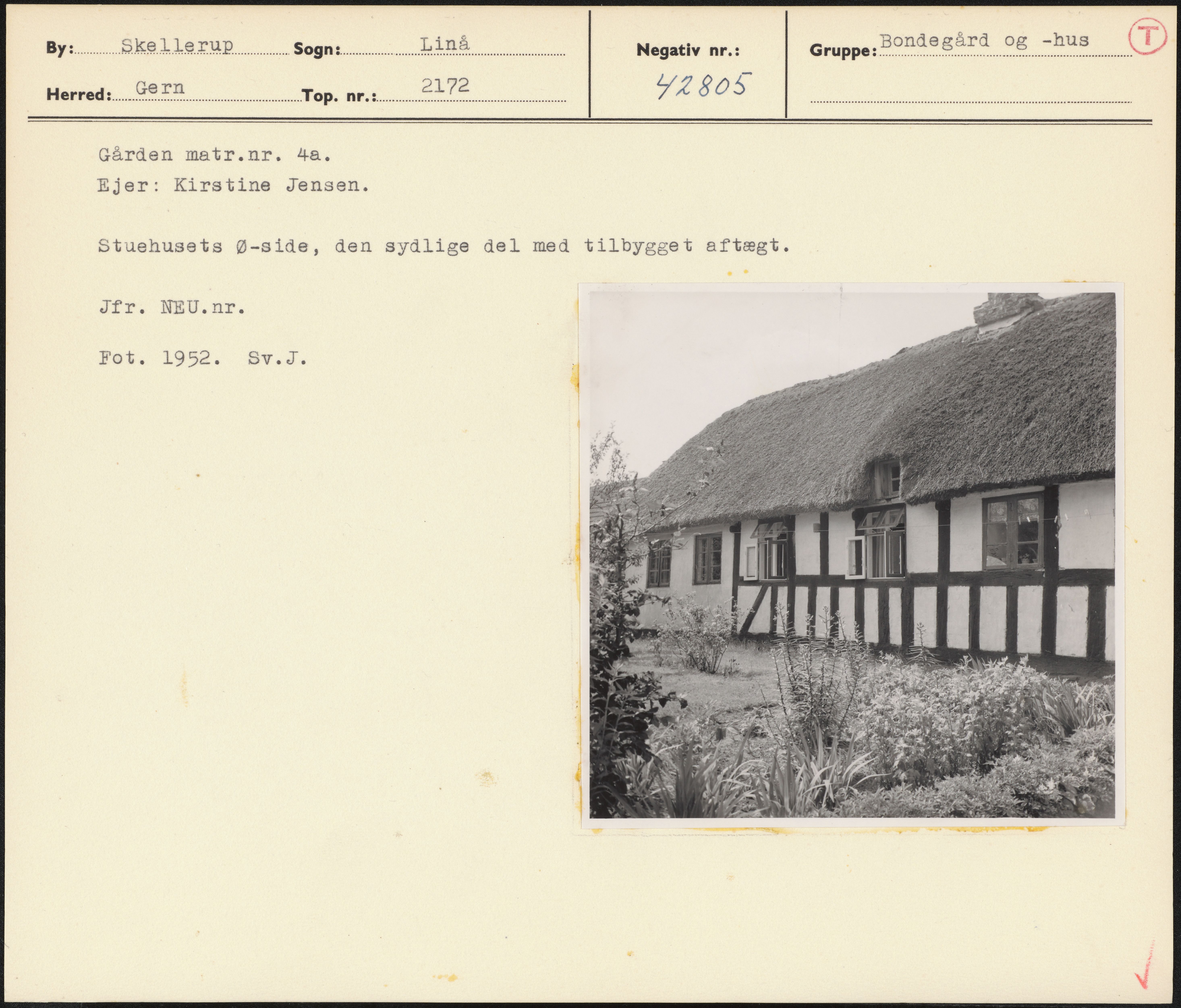 Maskingenkendt tekst fra arkivkort. Gården matr.nr. 4a. Ejer: Kirstine Jensen. Stuehusets Ø-side, den sydlige del med tilbygget aftægt. Jfr. NEU. nr. Fot. 1952. BSv.J. N