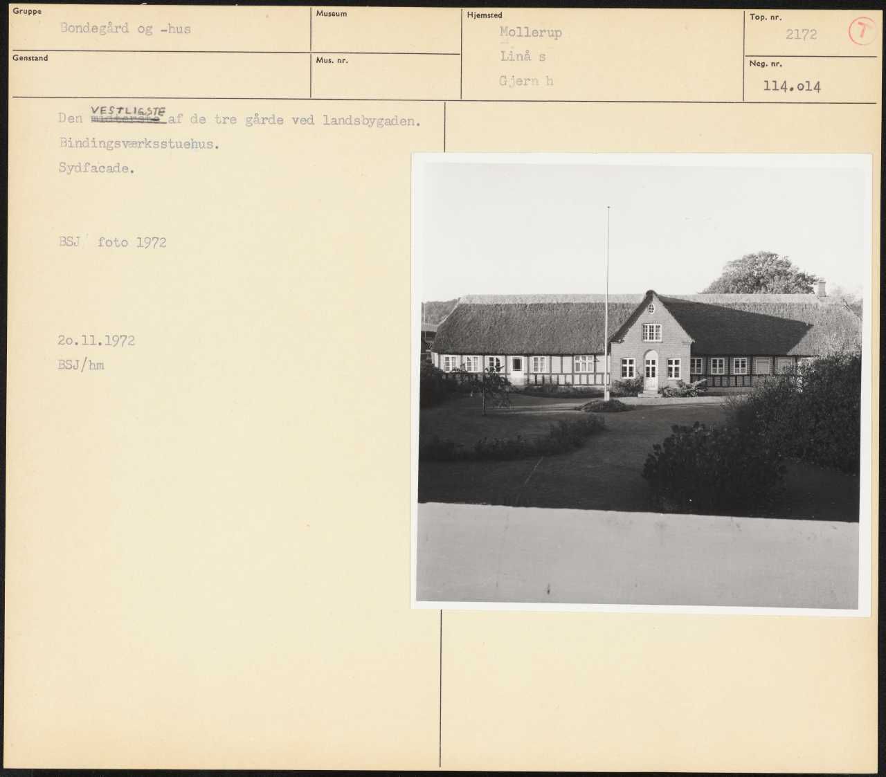Maskingenkendt tekst fra arkivkort. Den MESSEN of de tre gårde ved landsbygaden. Bindingsværksstuehus. Sydfacade. BSJ foto 1972 20.11.1972 BSJ/hm