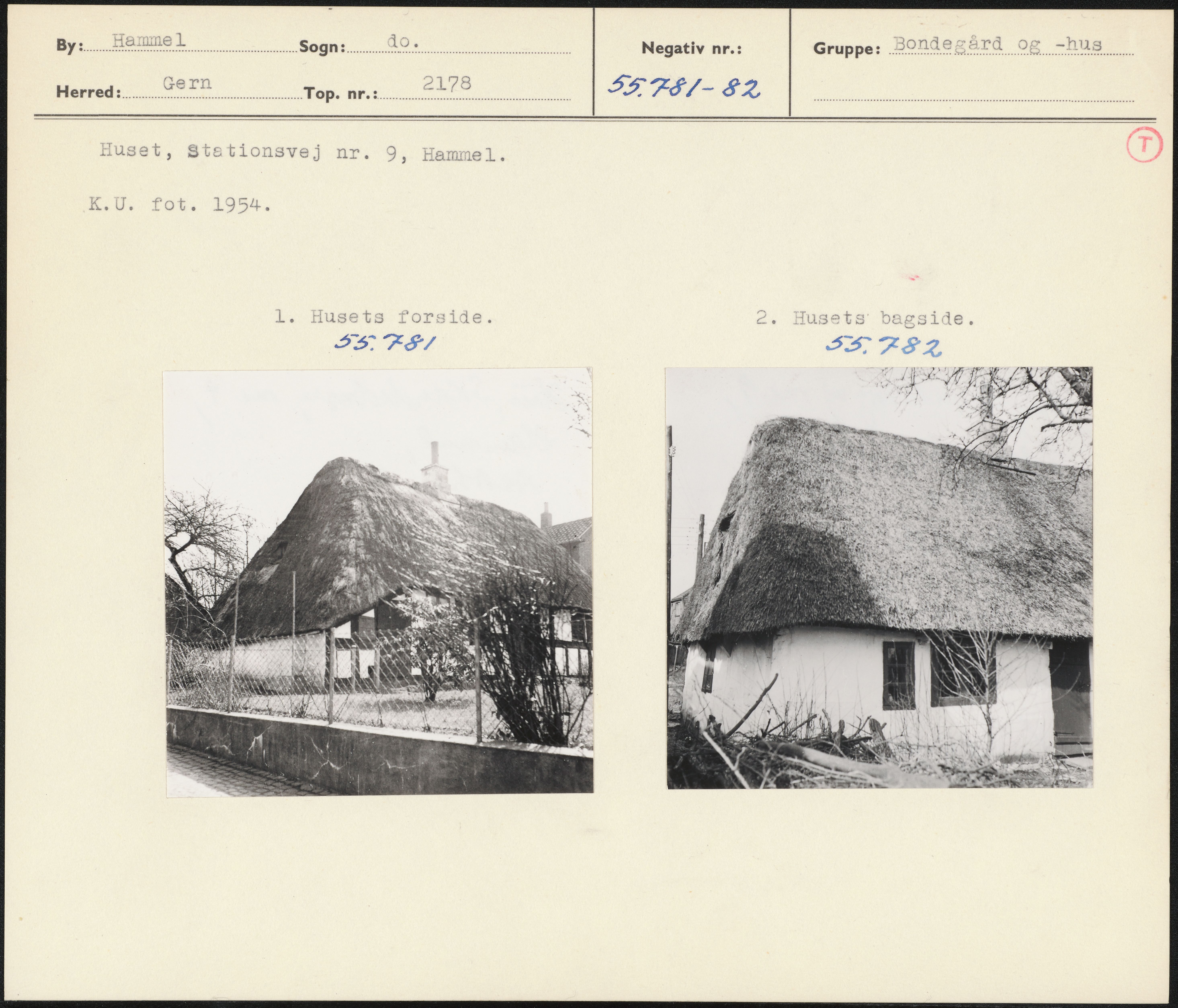 Maskingenkendt tekst fra arkivkort. m Huset, Stetionsvej nr. 9, Hammel(T K.U. fot. 1954. 1. Husets forside. 2. Husets bagside. SE FI 355782