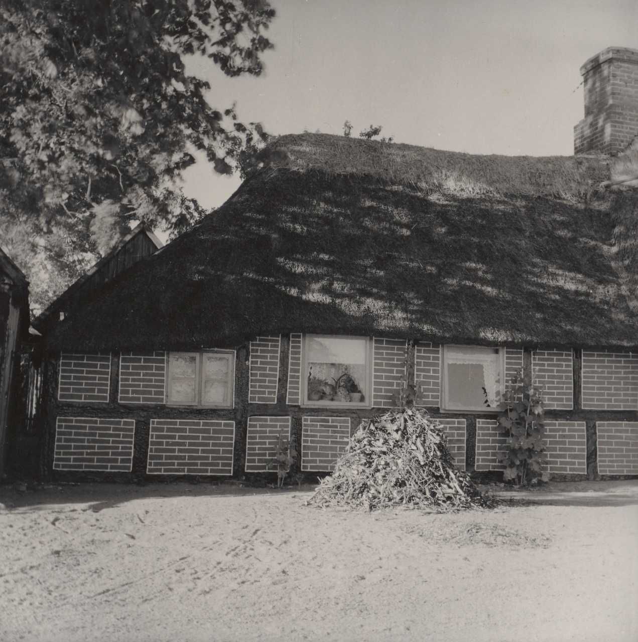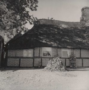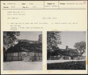 Maskingenkendt tekst fra arkivkort. Huset matr.nr. 9 1. Ejer: Søren Nielsen. Jfr. NEU.nr. Fot. 1952. Sv.J. 1. Vestlige del af huset med kove for enden, 2. Husets S-side, det fra SV. set fra syd. Bjælker i slids. Tavl af lersten af- stregey.